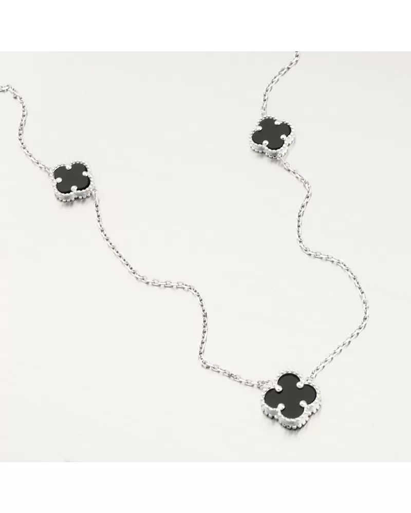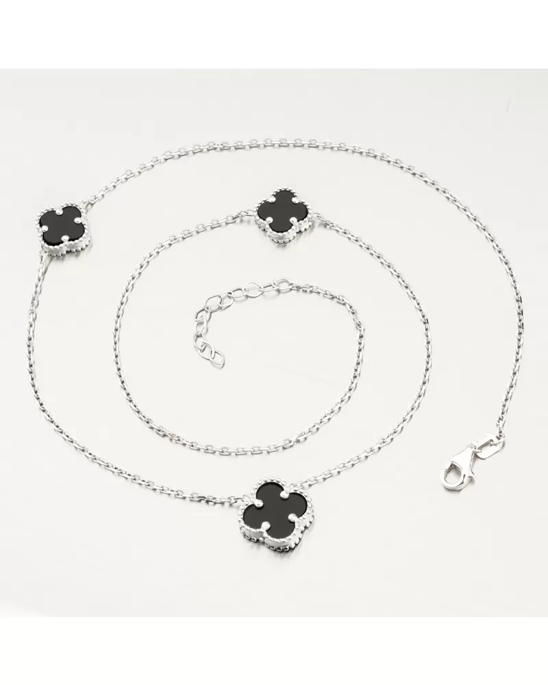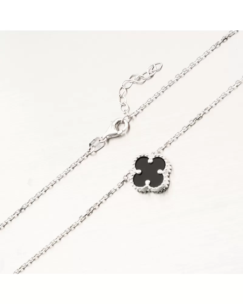 Černá barva dodává čtyřlístkům mystický nádech, zatímco samotný motiv symbolizuje štěstí, harmonii a ochranu. Náhrdelník je ideální pro ženu, která miluje výrazné, ale stále vkusné doplňky.