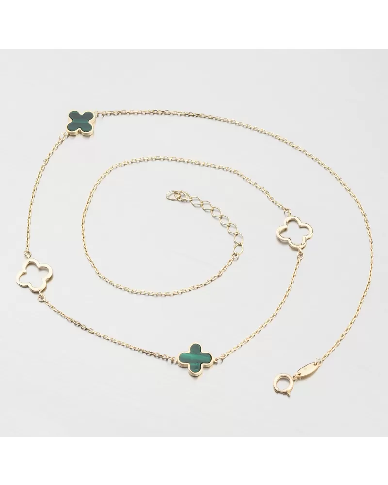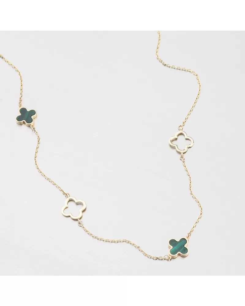 Tento zlatý náhrdelník zdobí čtyři jemné čtyřlístky, z toho dva v zeleném odstínu a poté dva obrysy čtyřlístku. Přívěsky podtrhují krásu náhrdelníku a dodávají celému šperku luxusní vzhled inspirovaný světovými designy.