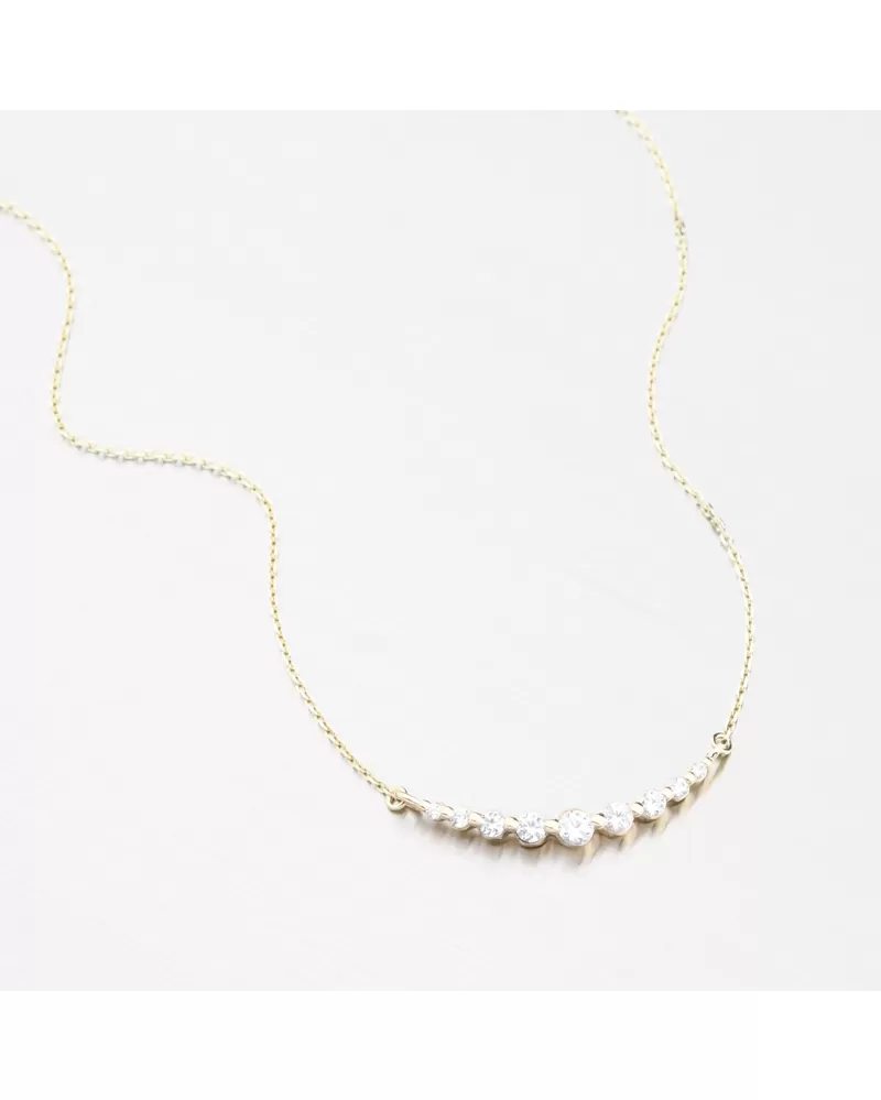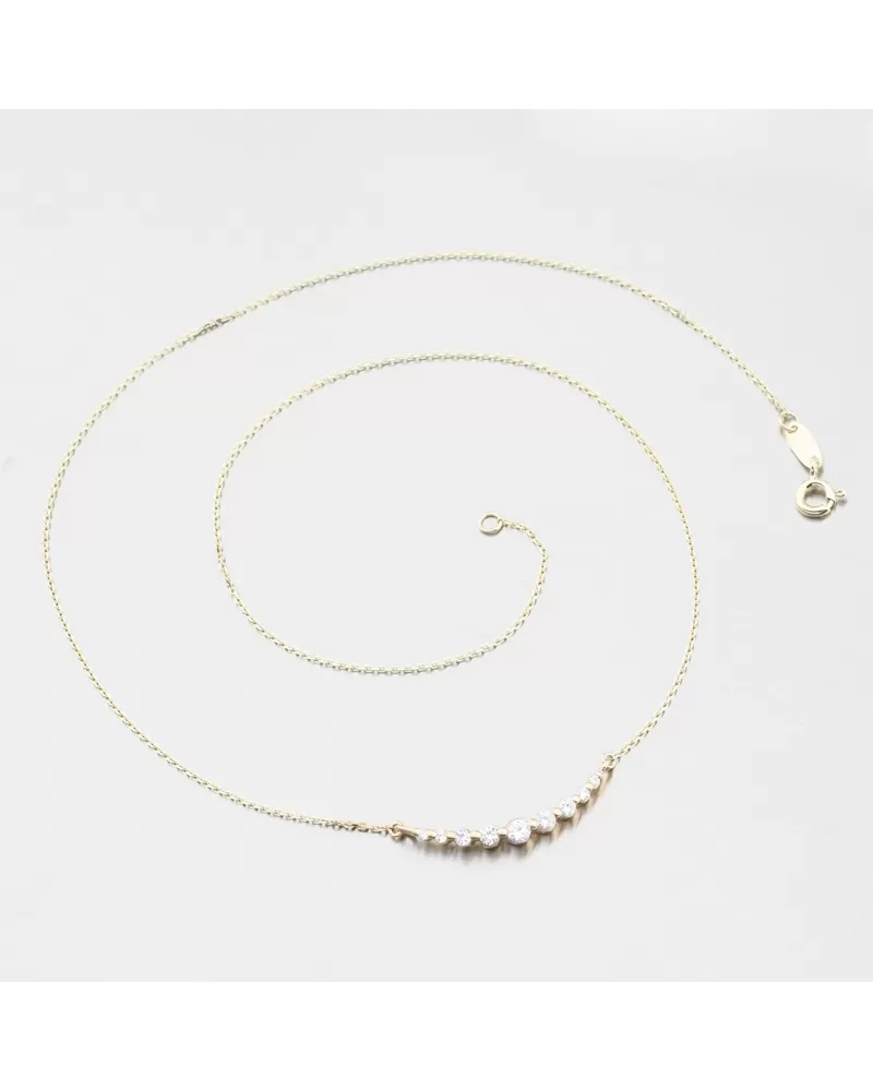 Zlatý náhrdelník se zirkony – jemná linie elegance a světla. Každý pohyb zachytí záblesk světla. Tento zlatý náhrdelník zdobí řada precizně broušených zirkonů, které přecházejí od menších po větší – vytvářejí tak plynulou, elegantní linii lesku. Zirkony jsou briliantového brusu, který zajišťuje maximální brilanci vybroušených facet, dokonale odráží světlo a neuvěřitelně září z každého úhlu pohledu. Design působí jemně, moderně a nesmírně ženským dojmem.
