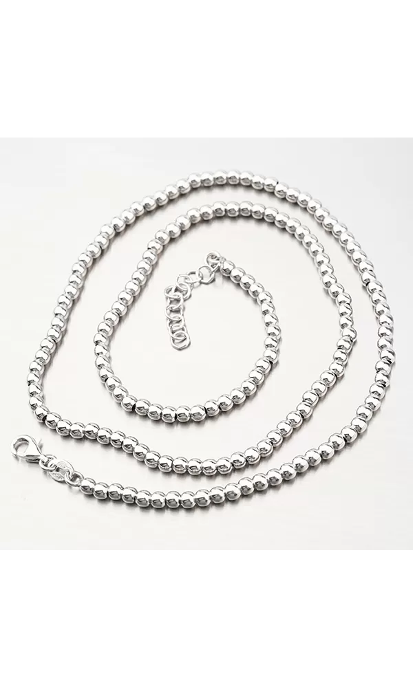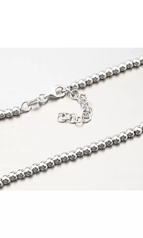 Elegantní stříbrný náhrdelník, kde jsou po celém obvodu lemované lesklé kuličky navlečené na řetízku.