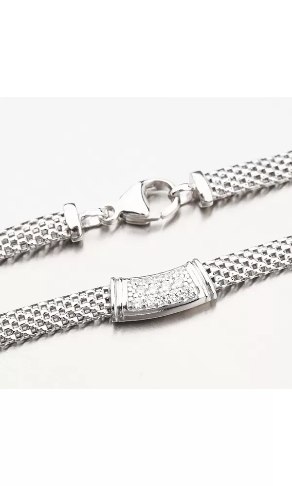 Propracovaný náhrdelník, který je tvořený z propleteného řetízku. Ve středu náhrdelníku je část osazená zářivými zirkony v briliantovém brusu a to ve třech řadách. Náhrdelník vypadá na první pohled luxusně.