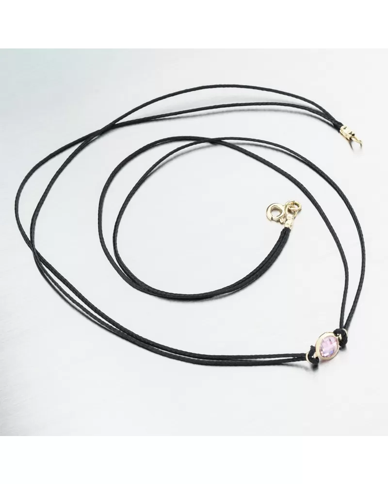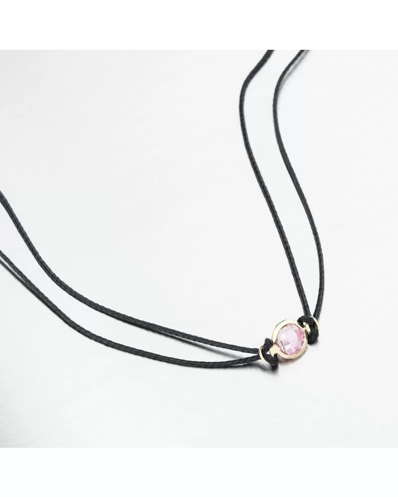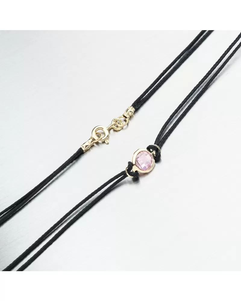Objevte šňůrkový náhrdelník se zlatým přívěskem – ručně vyráběný šperk, který spojuje styl, symboliku a luxus v jednom. Řetízek je tvořen z černého dvojitého provázku, který je ozdoben přívěskem v samotném středu ze žlutého zlata. Středový přívěsek zdobí precizně broušený zirkon v růžové barvě, který se při každém pohybu nádherně rozzáří a dodává náramku jiskru pravého luxusu.
