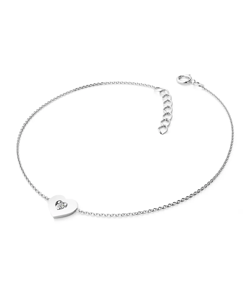 Chcete Vaši milé či blízké osobě udělat radost s něčím, co nikdo jiný nemá? Kupte jí tento náramek z bílého čtrnáctikarátového zlata 585/1000 s diamantem! Náramek tvoří řetízek typu anker s lesklými facetami na každém očku a se srdíčkem uprostřed. Srdce je symbolem lásky, takže pokud chcete svou milou zaujmout a vyznat jí lásku, nebo své blízké osobě ukázat, jak ji máte rádi a záleží vám na ni, tento náramek je přesně to, co hledáte! V srdíčku je vsazen jeden kulatý diamant, vybroušený kulatým briliantovým brusem, který zajišťuje maximální brilanci vybroušených facet ze všech úhlů pohledu! Vsazování diamantů provádějí naši nejzkušenější mistři zlatníci ručně pod mikroskopem s přesností na 0,01mm a proto nehrozí vypadnutí diamantů jako to bývá u strojně vyráběných šperků.