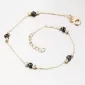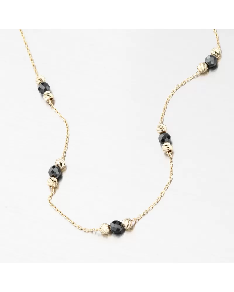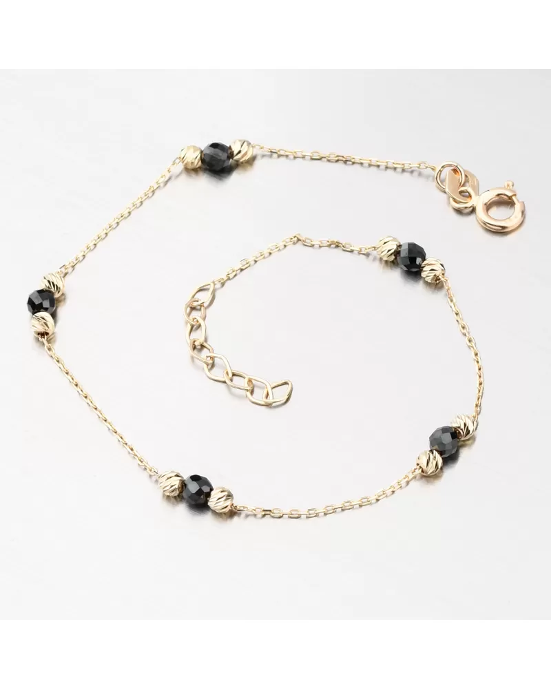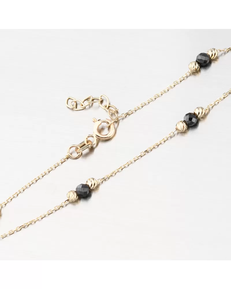 Jemný, ale přesto zářivý zlatý náramek, který nesmí chybět ve vaší šperkovnici. Náramek zdobí lesklé zlaté kuličky a mezi nimi je černý broušený zirkon. Kuličky jsou zdobeny facetami, které jsou zhotoveny diamantovým nástrojem, který dodává vzniklým facetám maximální lesk, díky kterému dokonale odráží světlo a mají krásnou brilanci ze všech úhlů pohledu.