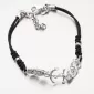 Moderní náramek tvořený z černého textilu a ze stříbrných částí. Ve středu se nachází přívěsek kotvy.