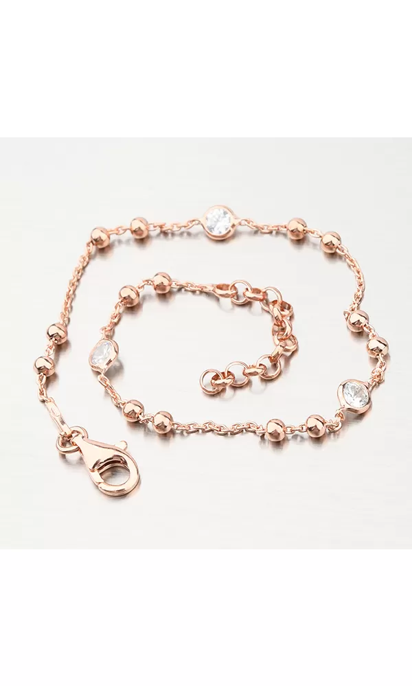 Jemný náramek typu Anker dekorovaný drobnými kuličkami a zářivými zirkony. Růžovou barvu zlata náramku dodává technika zlacení PVD. Předností zlacení technologií PVD je vysoká tvrdost a odolnost proti otěru! Jedná se o silnou vrstvu, která proniká do původního materiálu. Zlacení technologií PVD se dá srovnat s přibližně 12 mikrony galvanického zlacení, což je vysoká hodnota, která při běžném nošení vydrží až několik let.