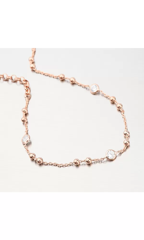 Jemný náramek typu Anker dekorovaný drobnými kuličkami a zářivými zirkony. Růžovou barvu zlata náramku dodává technika zlacení PVD. Předností zlacení… Celý popis