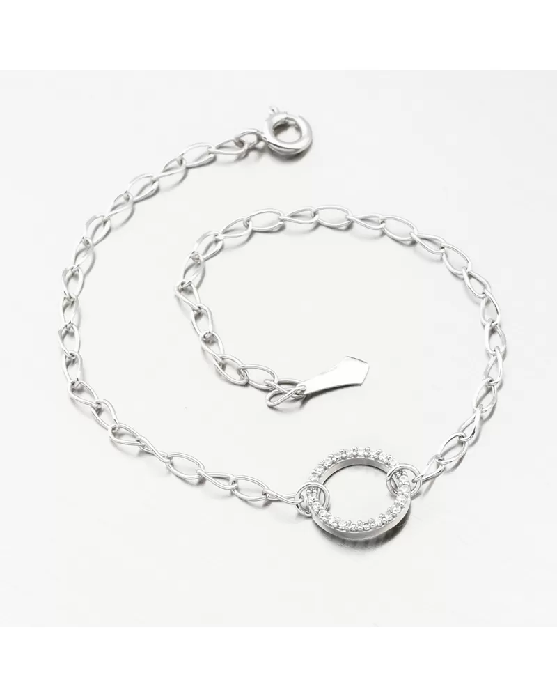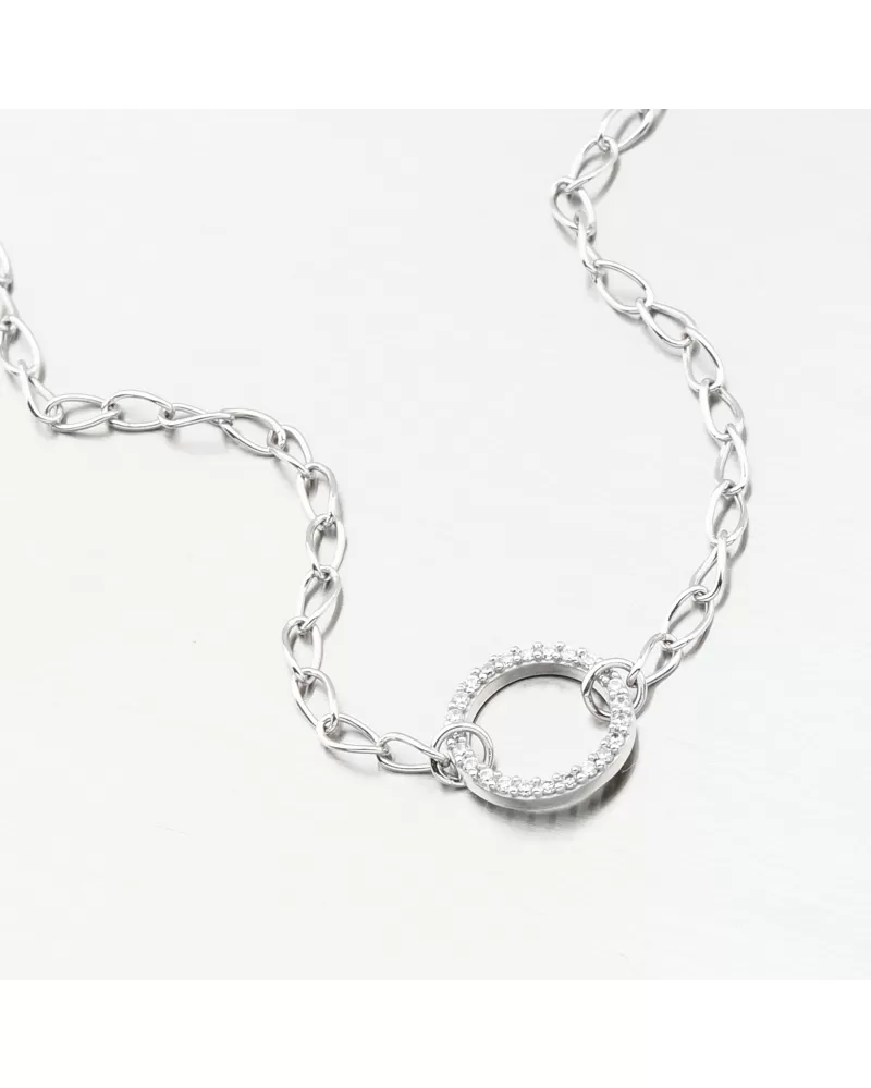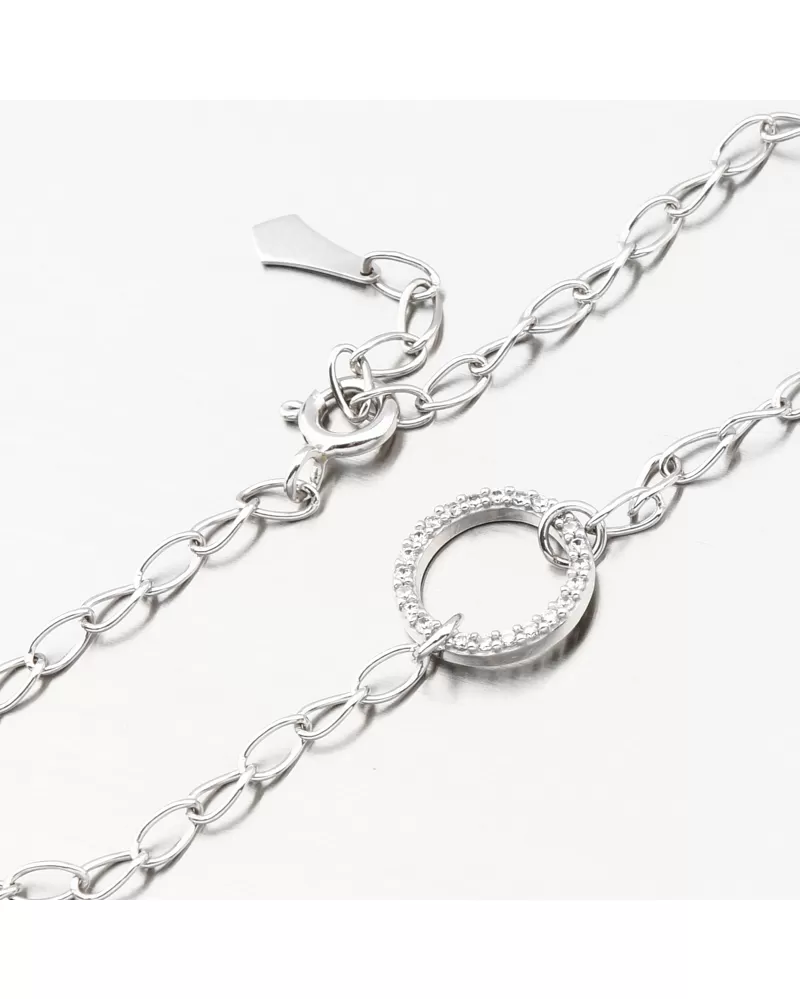 Výraznější šperk z bílého zlata ve formě náramku, Vám dokonale ozdobí zápěstí. Náramek je tvořen velkými oky, které uprostřed svírají přívěsek ve tvaru kruhu se zirkony. Délka náramku je 18 cm, ale díky velikosti oček je možné náramek zapnout i v kratší délce 16 až 18 cm. Nastavitelná délka má úžasnou výhodu v tom, že nemusíte znát přesnou velikost a darovaná osoba si délku přizpůsobí sama. Zapínání je na pérový kroužek.