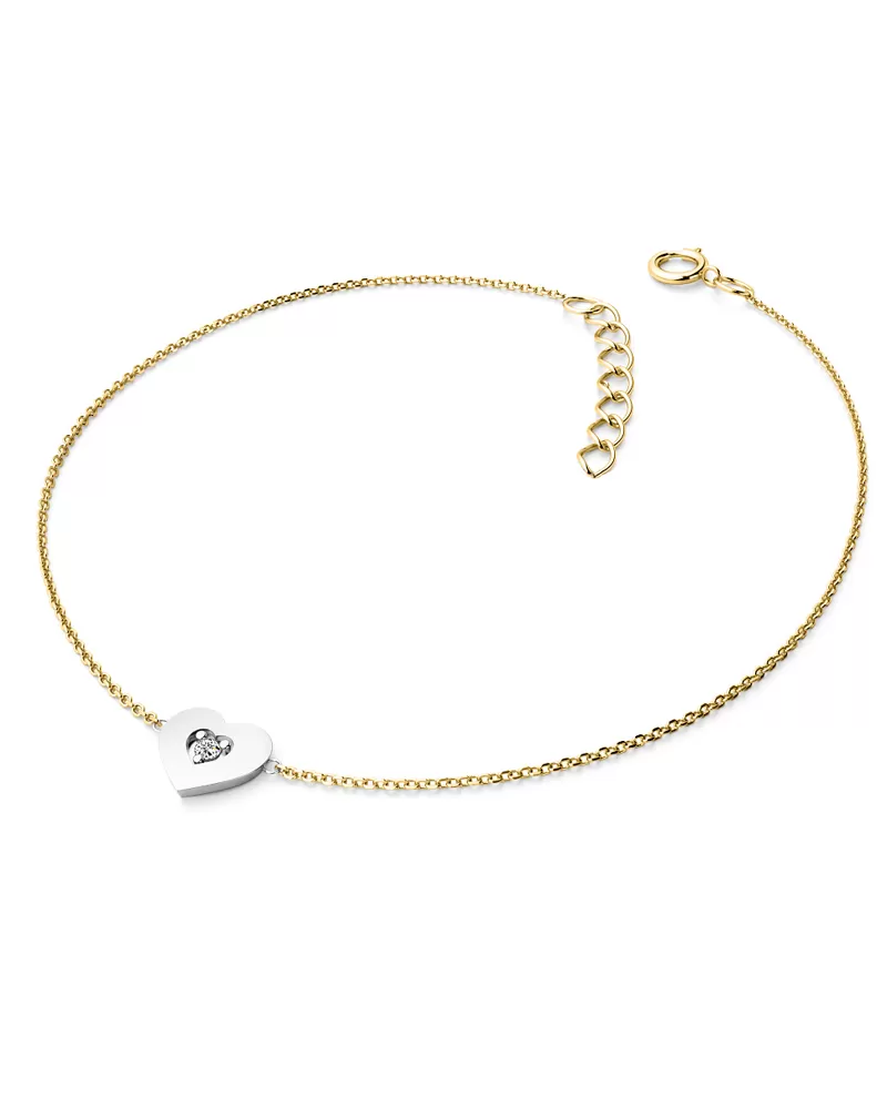 Chcete Vaši milé či blízké osobě udělat radost s něčím, co nikdo jiný nemá? Kupte jí tento náramek ze žlutého a bílého čtrnáctikarátového zlata 585/1000 s diamantem! Náramek tvoří řetízek typu anker s lesklými facetami na každém očku a se srdíčkem uprostřed. Srdce je symbolem lásky, takže pokud chcete svou milou zaujmout a vyznat jí lásku, nebo své blízké osobě ukázat, jak ji máte rádi a záleží vám na ni, tento náramek je přesně to, co hledáte! V srdíčku je vsazen jeden kulatý diamant, vybroušený kulatým briliantovým brusem, který zajišťuje maximální brilanci vybroušených facet ze všech úhlů pohledu! Vsazování diamantů provádějí naši nejzkušenější mistři zlatníci ručně pod mikroskopem s přesností na 0,01mm a proto nehrozí vypadnutí diamantů jako to bývá u strojně vyráběných šperků.