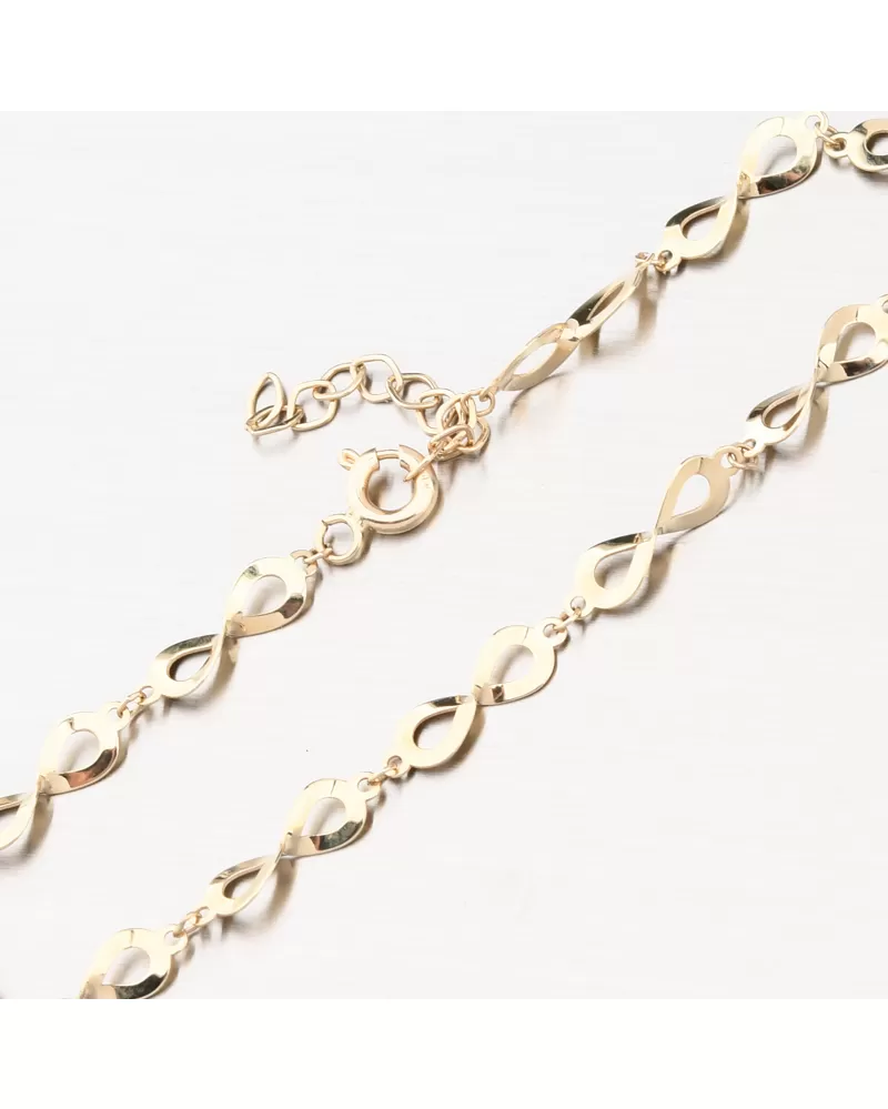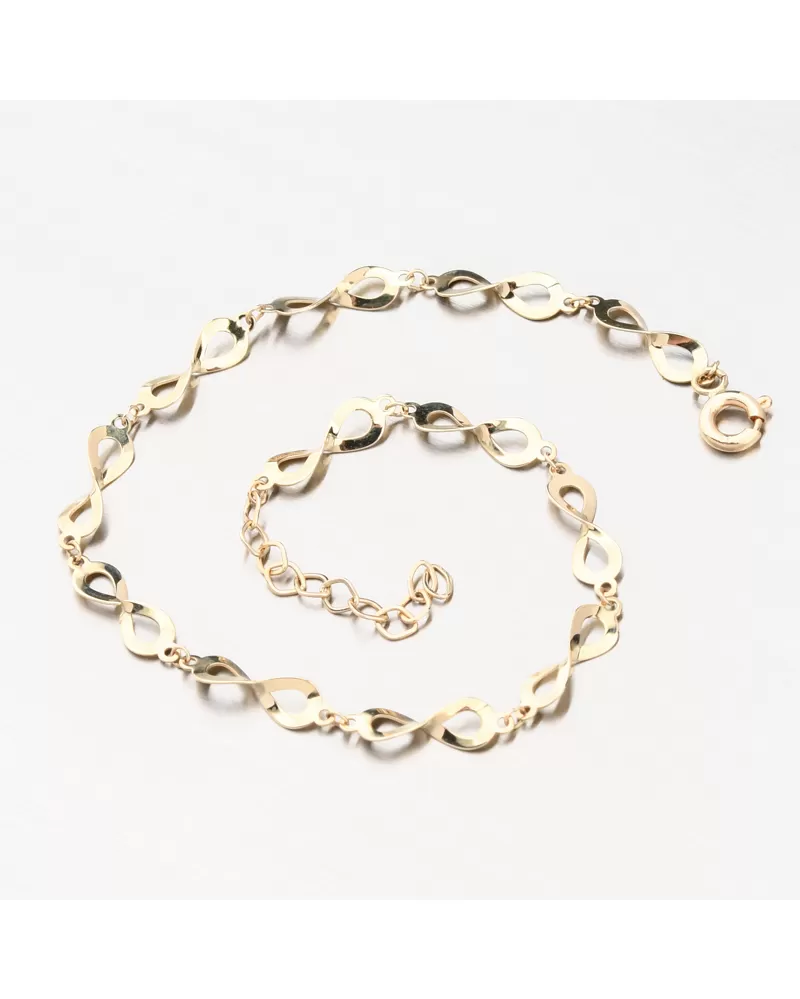 Elegantní zlatý náramek, který zaujme svým zpracováním. Náramek je tvořen symboly ve tvaru nekonečna, které jsou ale jemně zakroucené a tím je výsledný efekt velmi originální a o to celkově zajímavější.