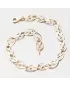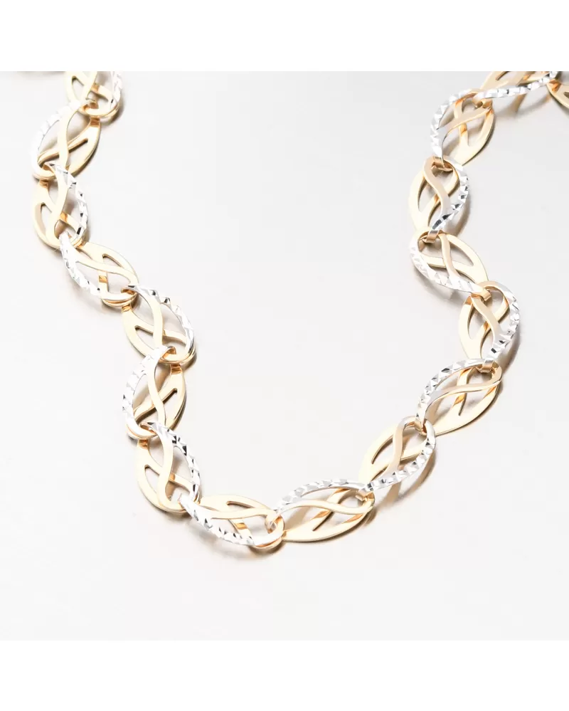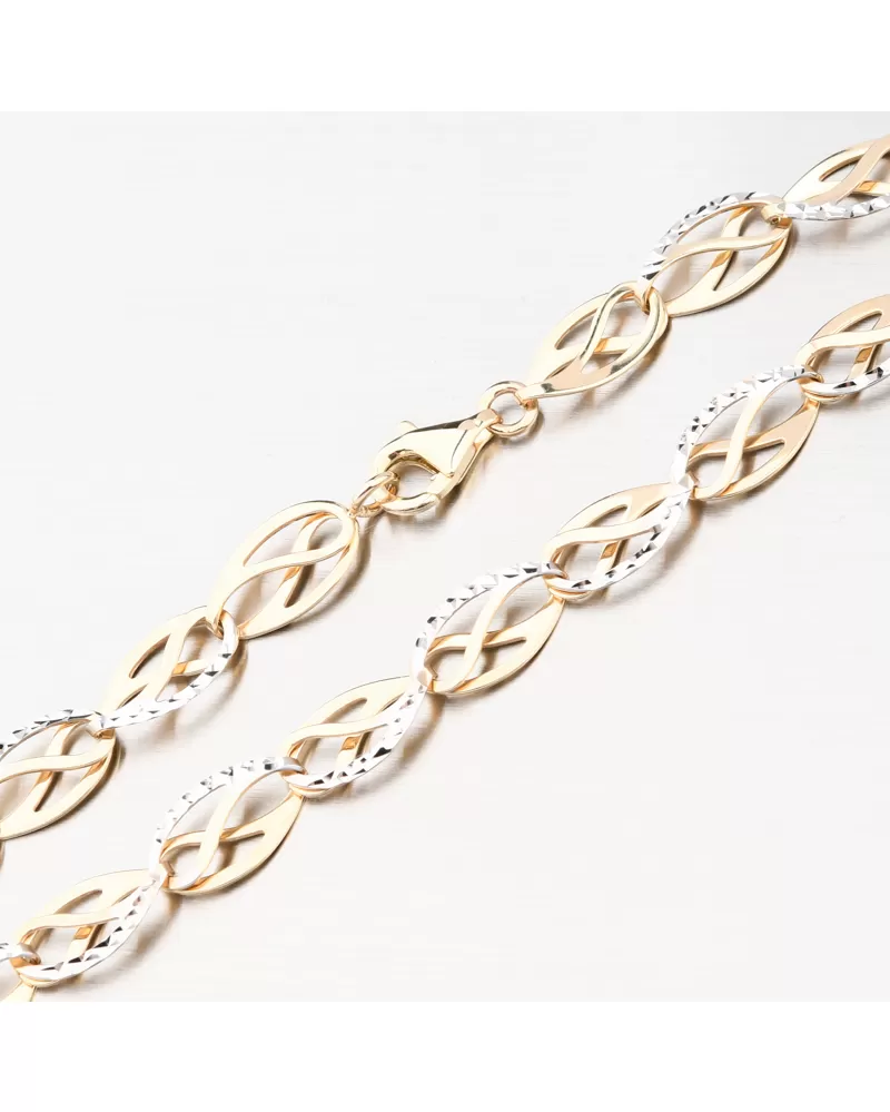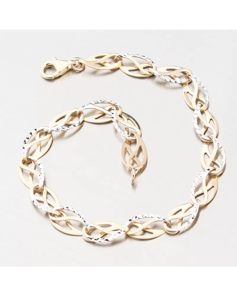 Výrazný zlatý náramek, který zaujme svým precizním zpracováním a který nesmí chybět ve Vaší šperkovnici. Náramek tvoří propletené oválné dílky, které jsou vždy na jedném okraji zdobené gravírováním v bílé barvě zlata.  Gravírování je zhotoveno diamantovým nástrojem, který dodává vzniklým facetám maximální lesk, díky kterému dokonale odráží světlo a mají krásnou brilanci ze všech úhlů pohledu. Zapínání náramku je na karabinu.