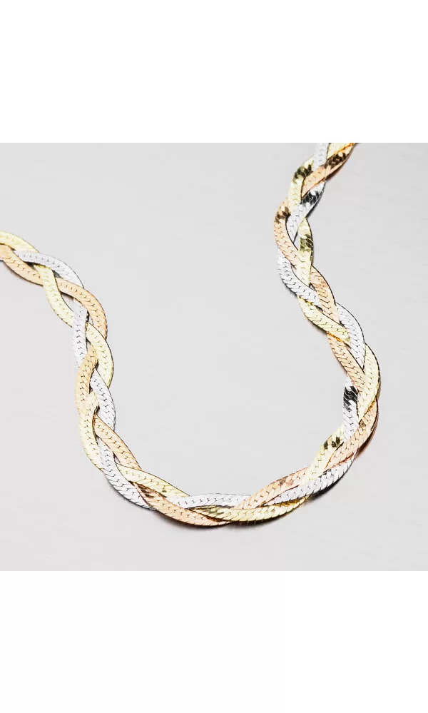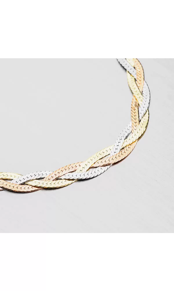 Buďte elegantní s tímto náramkem a oslňte okolí. Náramek je složen ze tří plochých řetízků, které jsou do sebe spleteny a tvoří tak cop. Každý s… Celý popis