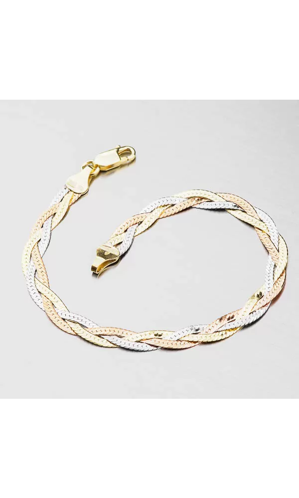 Buďte elegantní s tímto náramkem a oslňte okolí. Náramek je složen ze tří plochých řetízků, které jsou do sebe spleteny a tvoří tak cop. Každý s řetízků má jinou barvu a tím je náramek velmi přitažlivý. Dva z řetízků jsou zdobeny technikou zlacení PVD, která jim dodává žlutou a růžovou barvu zlata. Svym provedení náramek krásně přilne na zápěstí. Je pevný a nepřehlédnutelný. Dámský náramek je vyroben ze stříbra o ryzosti 925/1000 v lesklé povrchové úpravě. Stříbrný náramek zapnete karabinou.