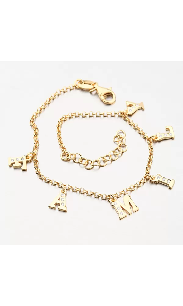 Zářivý náramek s písmenky, která dohromady dávají nápis FAMILY - nebo-li RODINA. Jednotlivá písmenka jsou zdobena zářivými zirkony. Žlutou barvu zlata náramku dodává technika zlacení PVD. Předností zlacení technologií PVD je vysoká tvrdost a odolnost proti otěru! Jedná se o silnou vrstvu, která proniká do původního materiálu. Zlacení technologií PVD se dá srovnat s přibližně 12 mikrony galvanického zlacení, což je vysoká hodnota, která při běžném nošení vydrží až 12 let.