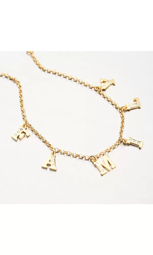 Zářivý náramek s písmenky, která dohromady dávají nápis FAMILY - nebo-li RODINA. Jednotlivá písmenka jsou zdobena zářivými zirkony. Žlutou barvu… Celý popis