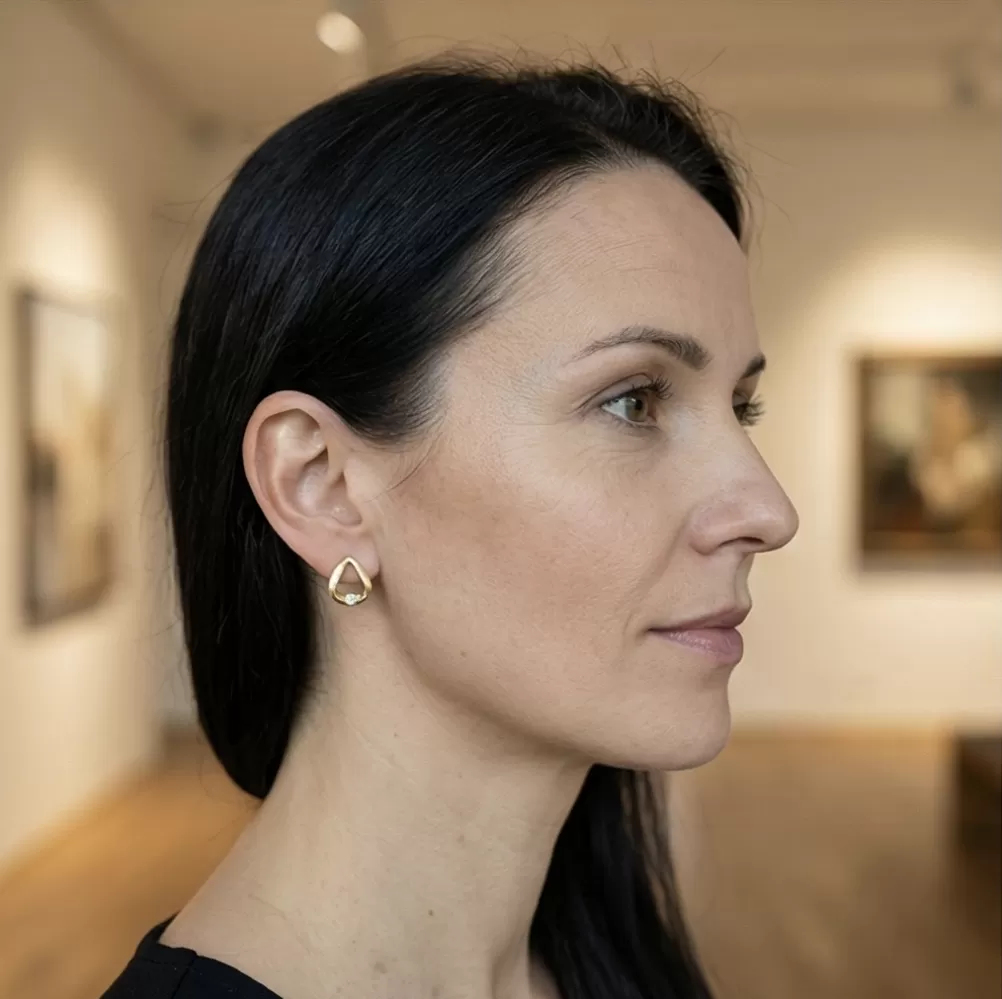 Náušnice jsou vyrobeny ze žlutého čtrnáctikarátového zlata - 585/1000 v kombinaci lesklé a matné povrchové úpravy. Náušnice se zapínají na šroubek. Do náušnic jsou vsazeny dva kulaté diamanty briliantového brusu, který zajišťuje maximální brilanci vybroušených facet. Diamanty jsou pevně uchyceny do čtyřech krapniček. Vsazování diamantů provádějí naši nejzkušenější mistři zlatníci ručně pod mikroskopem s přesností na 0,01mm a proto nehrozí vypadnutí kamínků jako to bývá u strojně vyráběných šperků. Náušnice působí jemným a elegantním dojmem!
