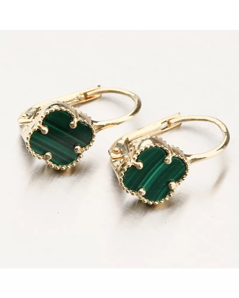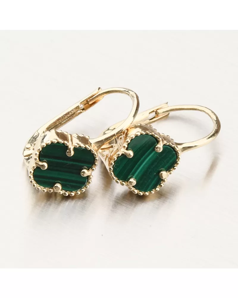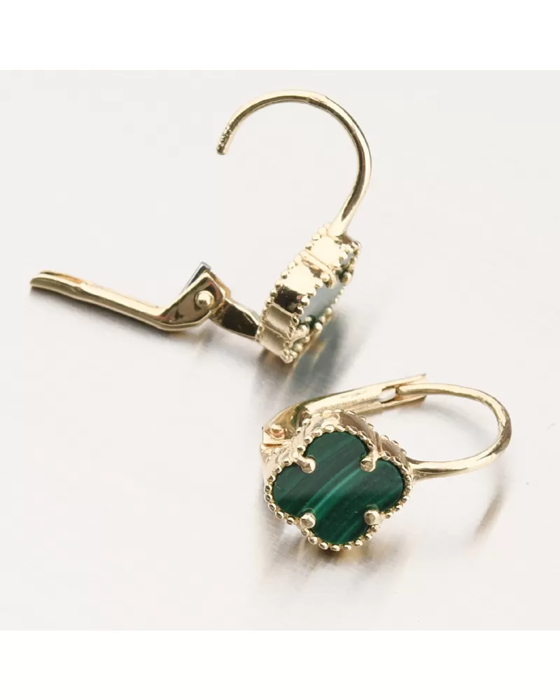 Moderní náušnice v oblíbeném tvaru čtyřlístku zdobené syntetickým malachitem v ozdobném zlatém rámečku. Syntetický malachit zaujme svou výraznou zelenou barvou se světlejšími pruhy, které vytvářejí typickou malachitovou kresbu. Je stabilní, lesklý a dodá šperku elegantní přírodní vzhled. Náušnice jsou dokonale zpracované do nejmenších detailů a budou tak ideálním dárkem, který zaručeně potěší dívku či ženu.