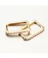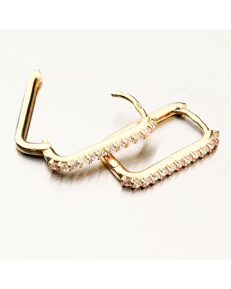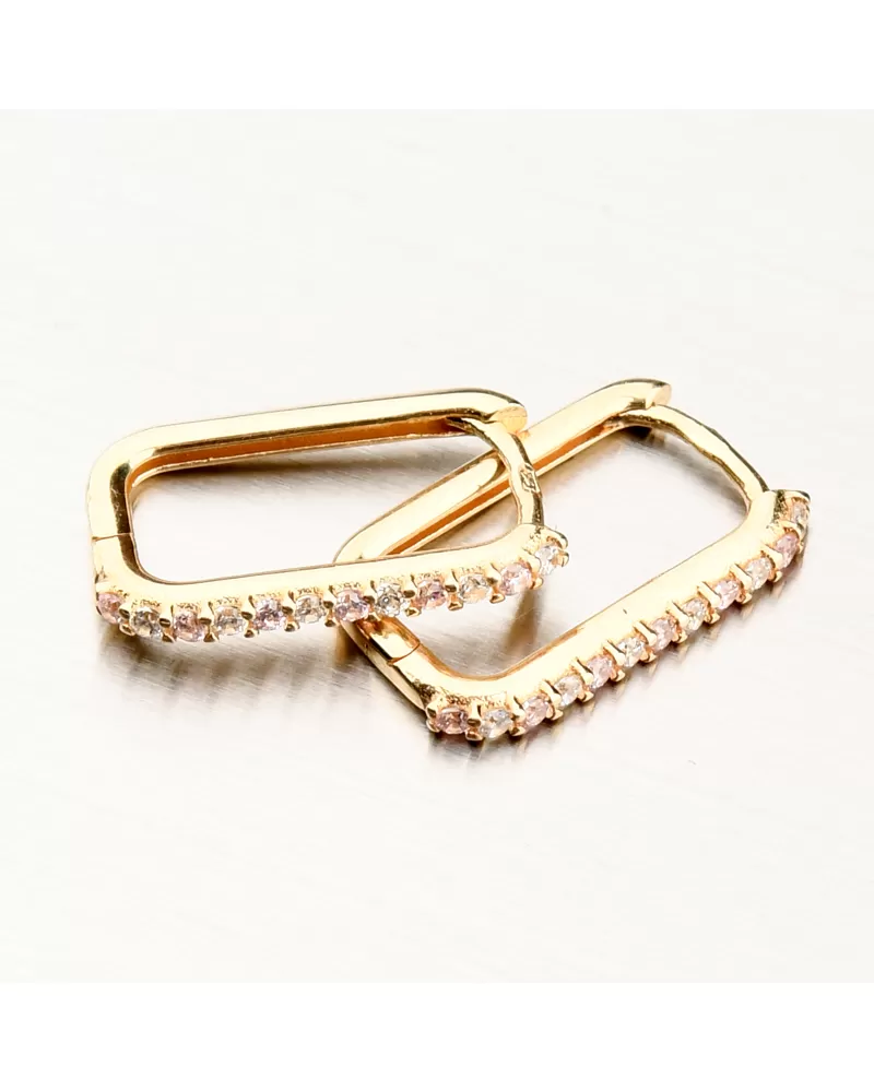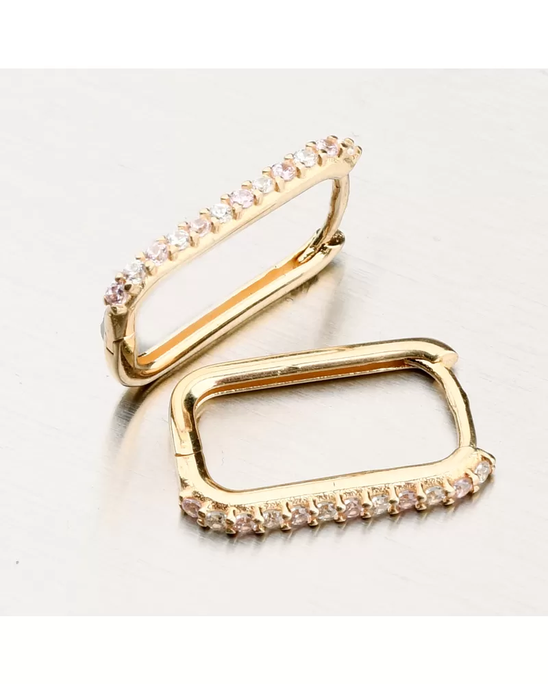 Jemné zlaté náušnice v minimalistickém designu. Ozdoba náušnic je hranatého tvaru a na přední straně osazena zirkony briliantového brusu, kde se střídá světle růžová barva s bílou barvou. Zirkony jsou briliantového brusu, který zajišťuje maximální brilanci vybroušených facet, dokonale odráží světlo a neuvěřitelně září z každého úhlu pohledu.
