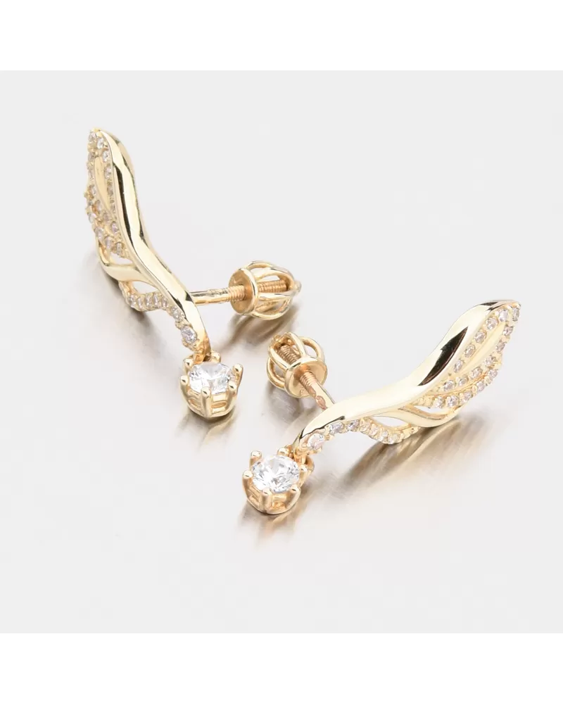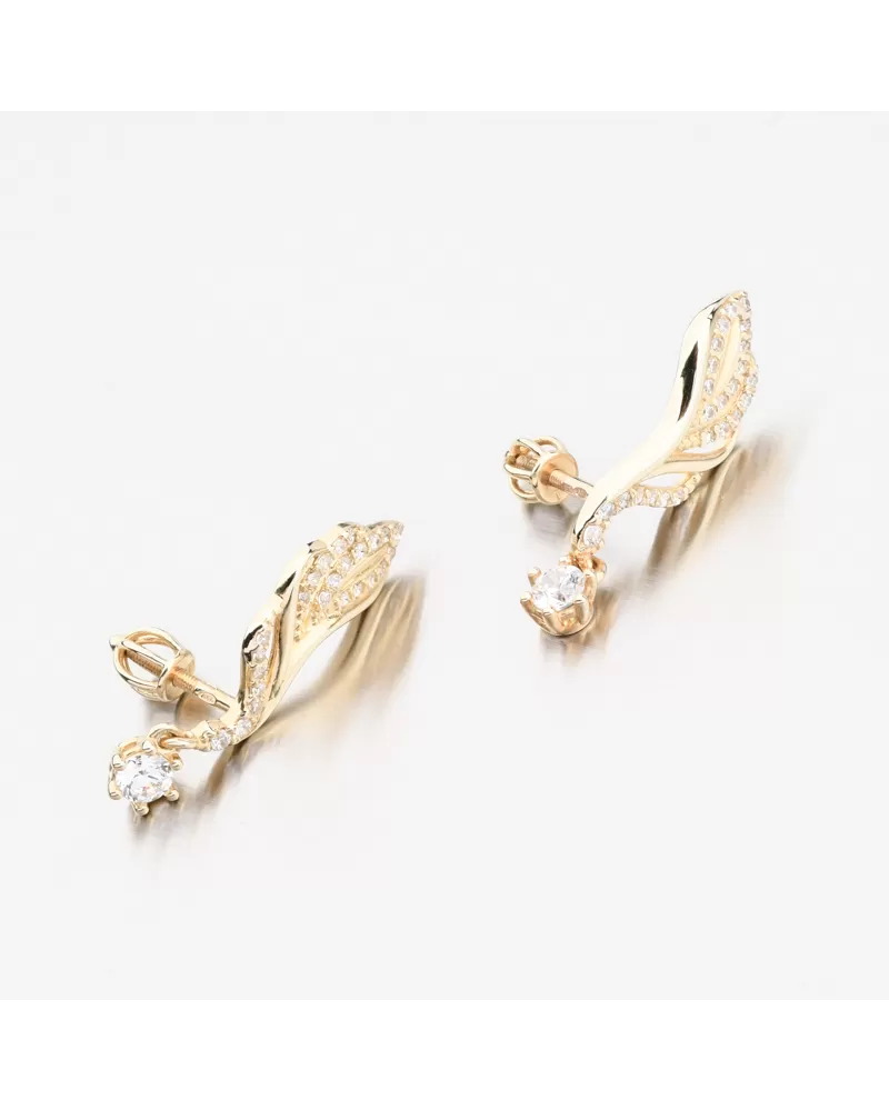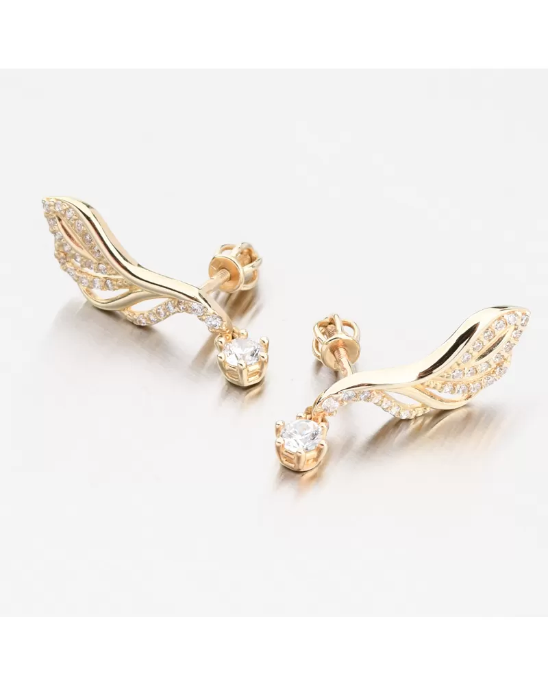 Zlaté náušnice s elegantním lemem a visícím zirkonem. Objevte jemnou eleganci a moderní design v podobě těchto nádherných zlatých náušnic. Jejich tvar je navržen tak, aby lemoval ušní lalůček, čímž vytváří originální a velmi ženský efekt. Horní linie náušnice je zdobena třpytivými zirkony různých velikostí, které dodávají šperku luxusní lesk. Pod ušní dírkou pak jemně visí větší čirý zirkon, který přitahuje světlo a krásně rozzáří celou tvář.