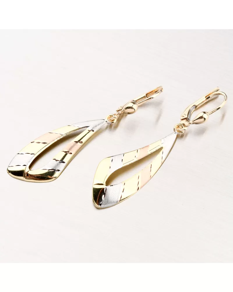 Tyto luxusní visací náušnice okouzlí svým výrazným provedením. Náušnice zdobí ozdoba, která je ve žluté, bílé a růžové barvy zlata. Z toho bílá a růžová barva je v matném provedení. Elegantní podlouhlý tvar prodlužuje siluetu a dodává celému vzhledu noblesu. Perfektní volba pro ženu, která touží po jedinečném šperku spojujícím originalitu a výjimečný styl. Náušnice zdobí facety, jedná se o lesklé plošky dělané za pomocí diamantového hrotu a dodávají šperku maximální lesk a brilanci ze všech úhlů.