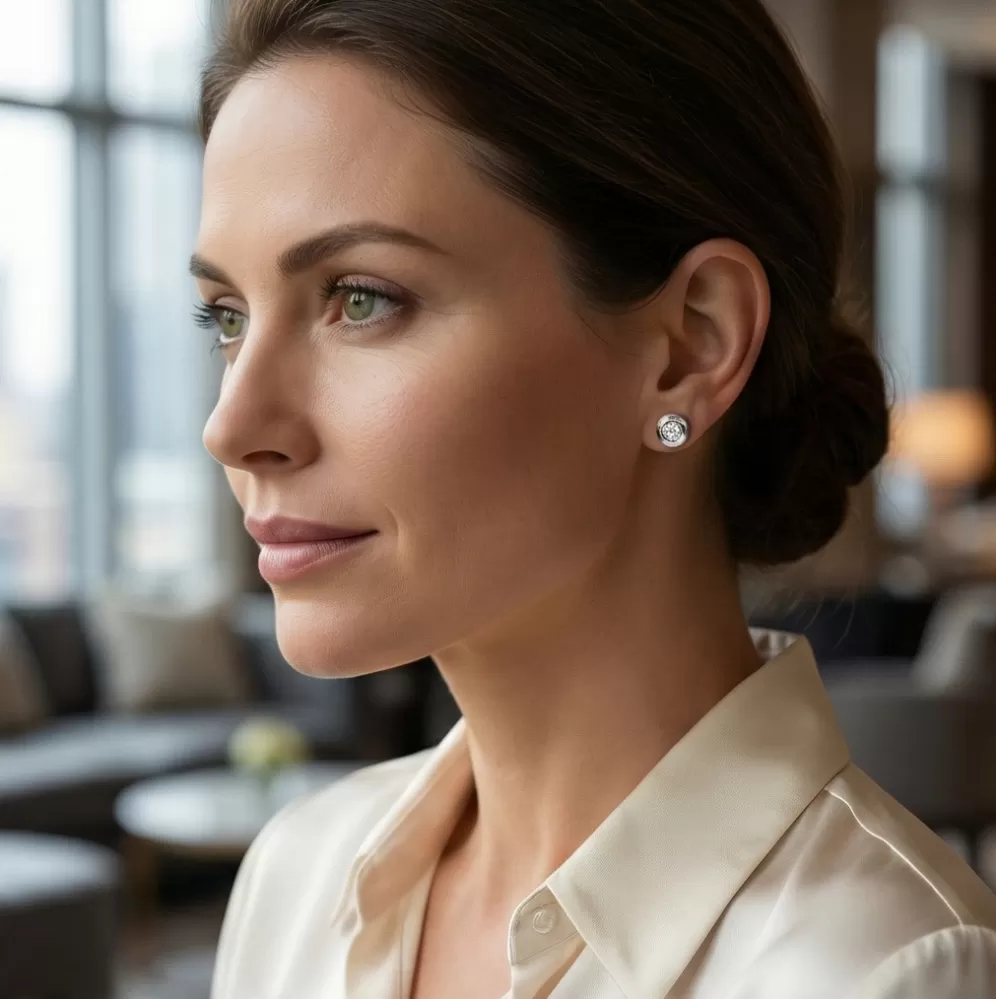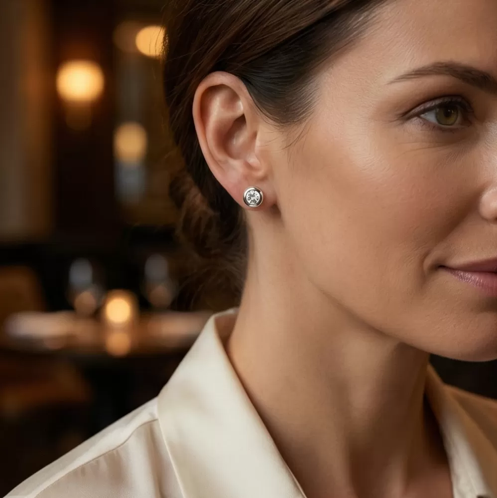 Klasický design náušnic v elegantní kombinaci lesklé obruby a diamantů . Tyto náušnice jsou vyrobeny z bílého čtrnáctikarátového zlata - 585/1000 a jsou celé v lesklé povrchové úpravě. Náušnice jsou zdobeny dvěma diamanty  briliantového brusu. Díky preciznímu brusu mají diamanty dokonalou brilanci. Skvěle odráží světlo a září.  Zapínání náušnic je na šroubky a balonky.