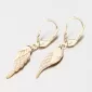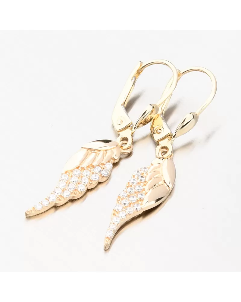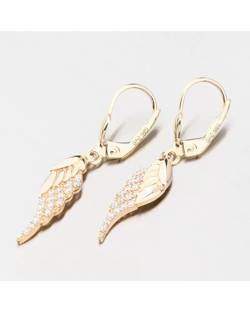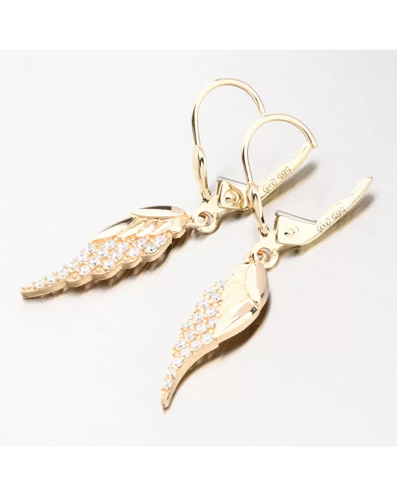 Nádherné visací zlaté náušnice, které zaujmou precizním provedením a kvalitním zpracováním. Náušnice mají visací ozdobu ve tvaru andělského křídla, kde jeho část je osazena zářivými zirkony a zbylá část je ve vysokém lesku. Zirkony jsou briliantového brusu, který propůjčuje zirkonům brilanci pravých diamantů, který podpoří i konstrukce náušnic. Konstrukce je navržena tak aby dokonale prostupovalo světlo kolem zirkonů.