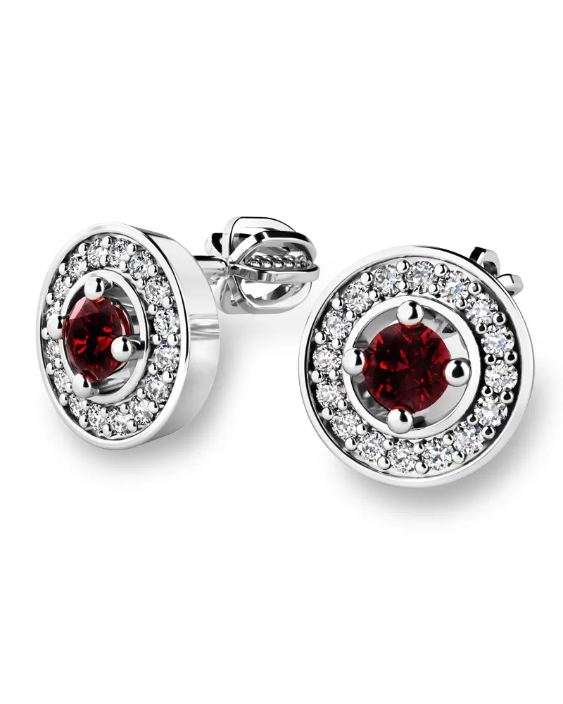Nádherné luxusní dámské náušnice pecky osázené středovým granátem a diamanty budou ideálním dárkem pro každou ženu. Náušnice jsou vyrobeny z bílého čtrnáctikarátového zlata - 585/1000 v lesklé povrchové úpravě. Vsazené diamanty jsou vybroušeny dokonalým briliantovým brusem, díky kterému dokonale odráží světlo a jejich brilance neuvěřitelné září z každého úhlu pohledu!  Všechny kameny jsou pevně uchyceny krapnami. Vsazování diamantů a drahých kamenů provádějí naši nejzkušenější mistři zlatníci ručně pod mikroskopem s přesností na 0,01mm a proto nehrozí vypadnutí kamínků jako to bývá u strojně vyráběných náušnic. Celé náušnice působí dokonalým a luxusním dojmem! Náušnice se zapínají na šroubek. Šroubek pro balónek je umístěný cca 2 mm pod horní okraj náušnice a tedy krásně zakrývá dírku v uchu.