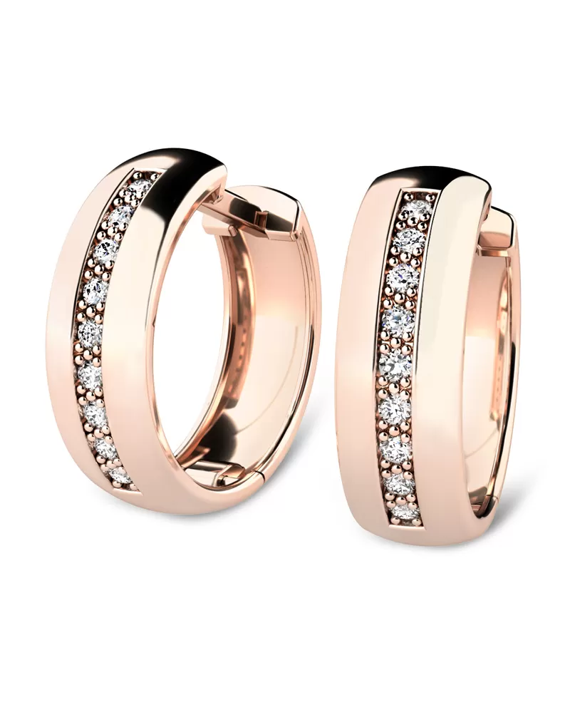 Náušnice kruhy patří mezi vůbec nejoblíbenější typ náušnic, náušnice jsou vhodné pro každodenní nošení i na společenské akce a sluší každé ženě! Jsou vyrobeny z růžového čtrnáctikarátového zlata - 585/1000 v lesklé povrchové úpravě. V náušnicích je vsazeno "do zrnek" osmnáct kulatých diamantů, vybroušený kulatým briliantovým brusem, který zajišťuje maximální brilanci vybroušených facet ze všech úhlů pohledu! Vsazování diamantů provádějí naši nejzkušenější mistři zlatníci ručně pod mikroskopem s přesností na 0,01mm a proto nehrozí vypadnutí diamantů jako to bývá u strojně vyráběných šperků. Náušnice jsou středně velké, na uchu vypadají elegantně a přirozeně!