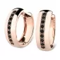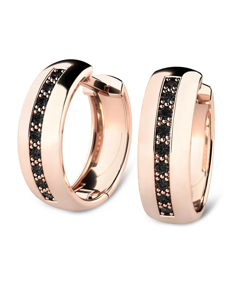 Náušnice kruhy patří mezi vůbec nejoblíbenější typ náušnic, náušnice jsou vhodné pro každodenní nošení i na společenské akce a sluší každé ženě! Jsou vyrobeny z růžového čtrnáctikarátového zlata - 585/1000 v lesklé povrchové úpravě. V každé náušnici je vsazeno "do zrnek" devět kulatých diamantů černé barvy. Vsazování diamantů provádějí naši nejzkušenější mistři zlatníci ručně pod mikroskopem s přesností na 0,01mm a proto nehrozí vypadnutí diamantů jako to bývá u strojně vyráběných šperků. Náušnice jsou středně velké, na uchu vypadají elegantně a přirozeně!