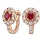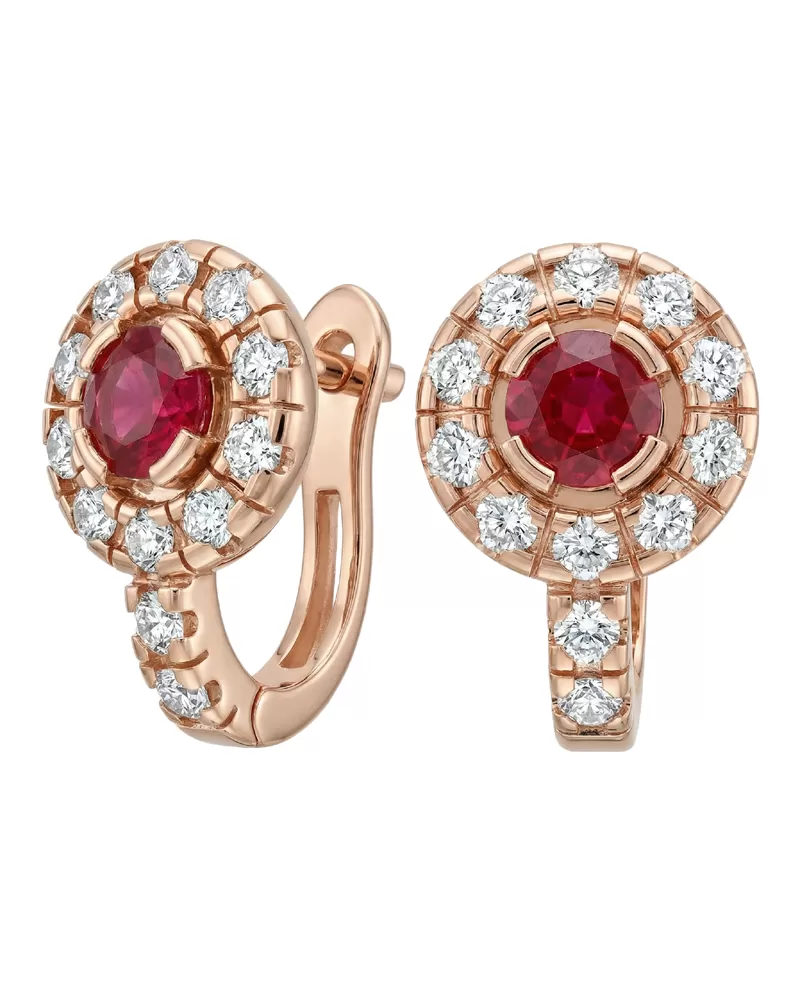 Náušnice typu "podkovičky" patří mezi velmi oblíbené typy náušnic, náušnice jsou vhodné pro každodenní nošení i na společenské akce a sluší každé ženě! Jsou vyrobeny z růžového čtrnáctikarátového zlata - 585/1000 v lesklé povrchové úpravě. V náušnicích je vsazeno "do krapniček" dvacetčtyři menších diamantů a dva větší centrální rubíny. Všechny kameny jsou vybroušeny kulatým briliantovým brusem, který zajišťuje maximální brilanci vybroušených facet ze všech úhlů pohledu! Vsazování diamantů a drahokamů provádějí naši nejzkušenější mistři zlatníci ručně pod mikroskopem s přesností na 0,01mm a proto nehrozí vypadnutí diamantů jako to bývá u strojně vyráběných šperků. Náušnice jsou středně velké, na uchu vypadají elegantně a přirozeně a díky skladbě a stylově čistému vsazení diamantů vynikají krásnou brilancí kamenů!