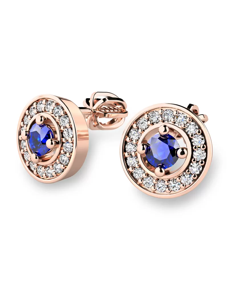 Nádherné luxusní dámské náušnice pecky osázené středovým safírem a diamanty budou ideálním dárkem pro každou ženu. Náušnice jsou vyrobeny z růžového čtrnáctikarátového zlata - 585/1000 v lesklé povrchové úpravě. Vsazené diamanty jsou vybroušeny dokonalým briliantovým brusem, díky kterému dokonale odráží světlo a jejich brilance neuvěřitelné září z každého úhlu pohledu! Všechny kameny jsou pevně uchyceny krapnami. Vsazování diamantů a drahých kamenů provádějí naši nejzkušenější mistři zlatníci ručně pod mikroskopem s přesností na 0,01mm a proto nehrozí vypadnutí kamínků jako to bývá u strojně vyráběných náušnic. Celé náušnice působí dokonalým a luxusním dojmem! Náušnice se zapínají na šroubek. Šroubek pro balónek je umístěný cca 2 mm pod horní okraj náušnice a tedy krásně zakrývá dírku v uchu.