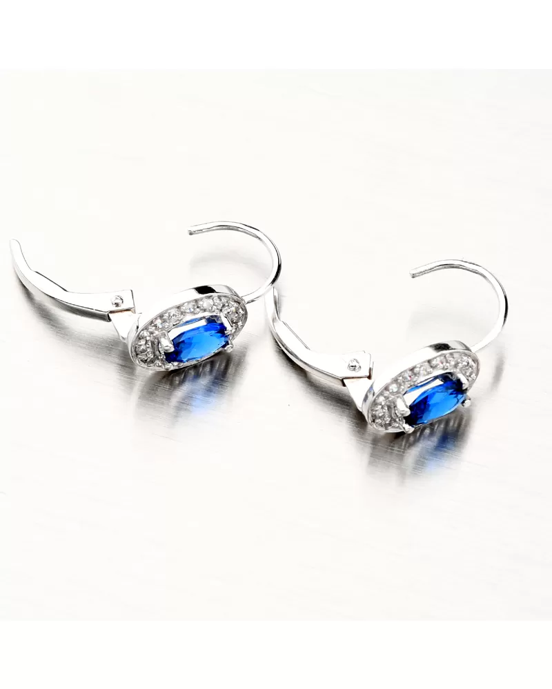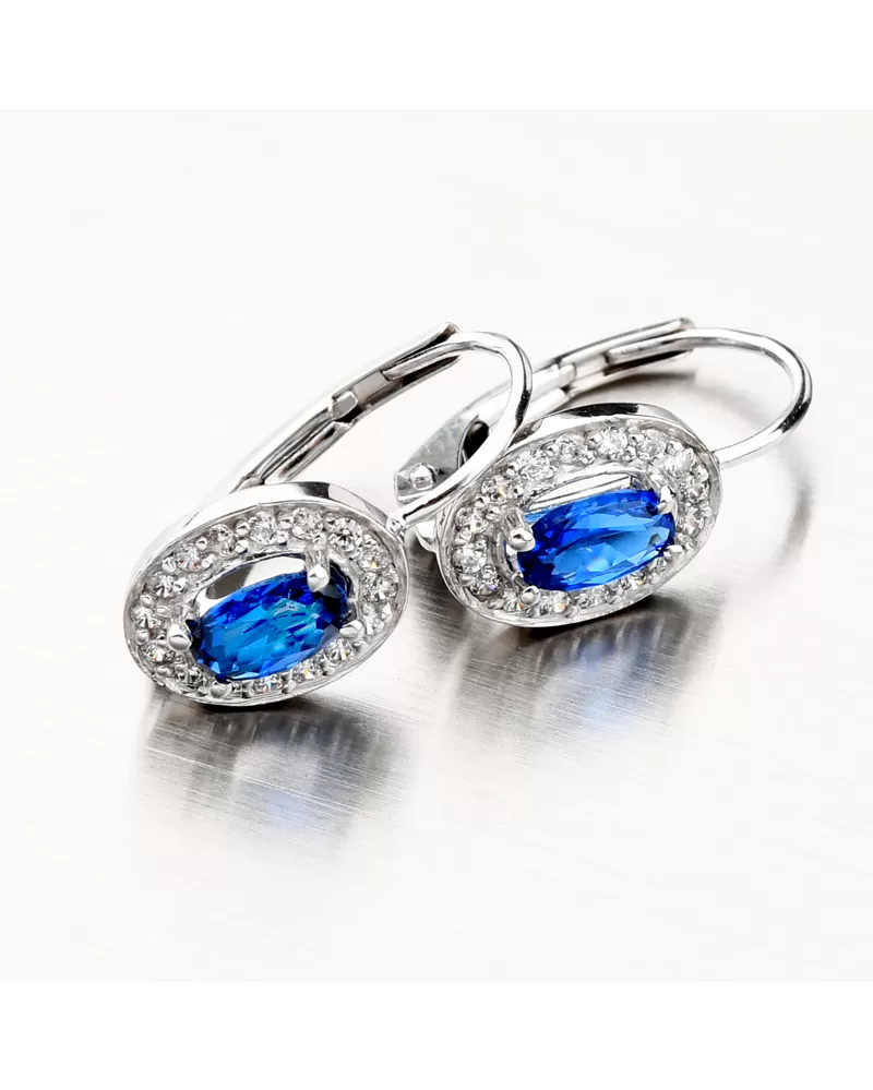 Zlaté náušnice se můžou pyšnit syntetickým modrým safírem oválného tvaru upevněný pomocí čtyř krapen. Safír je dominantou tohoto modelu náušnic a je především volbou pro elegantní a sofistikovaný vzhled. Okolo safíru jsou vsazeny zirkony briliantového brusu. Tento brus propůjčuje kamenům brilanci pravých diamantů.