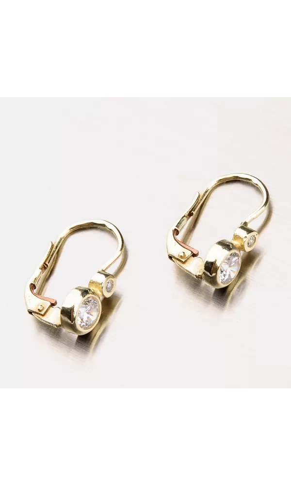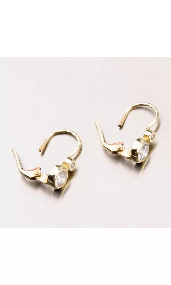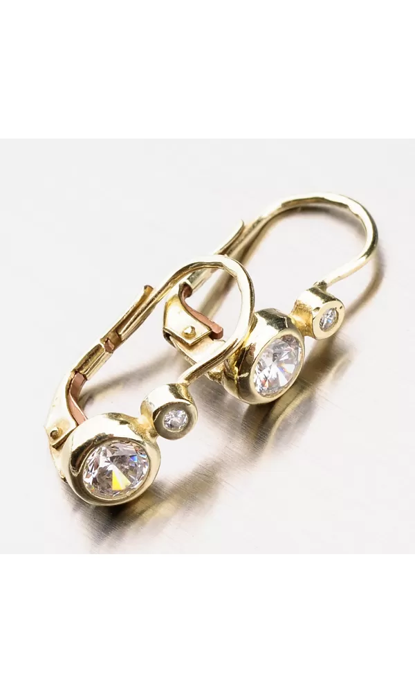 Jednoduché dámské zlaté náušnice, zdobené jedním velkým bílým zirkonem a jedním menším se hodí pro každodenní nošení. Dámské náušnice vyrobené ze… Celý popis