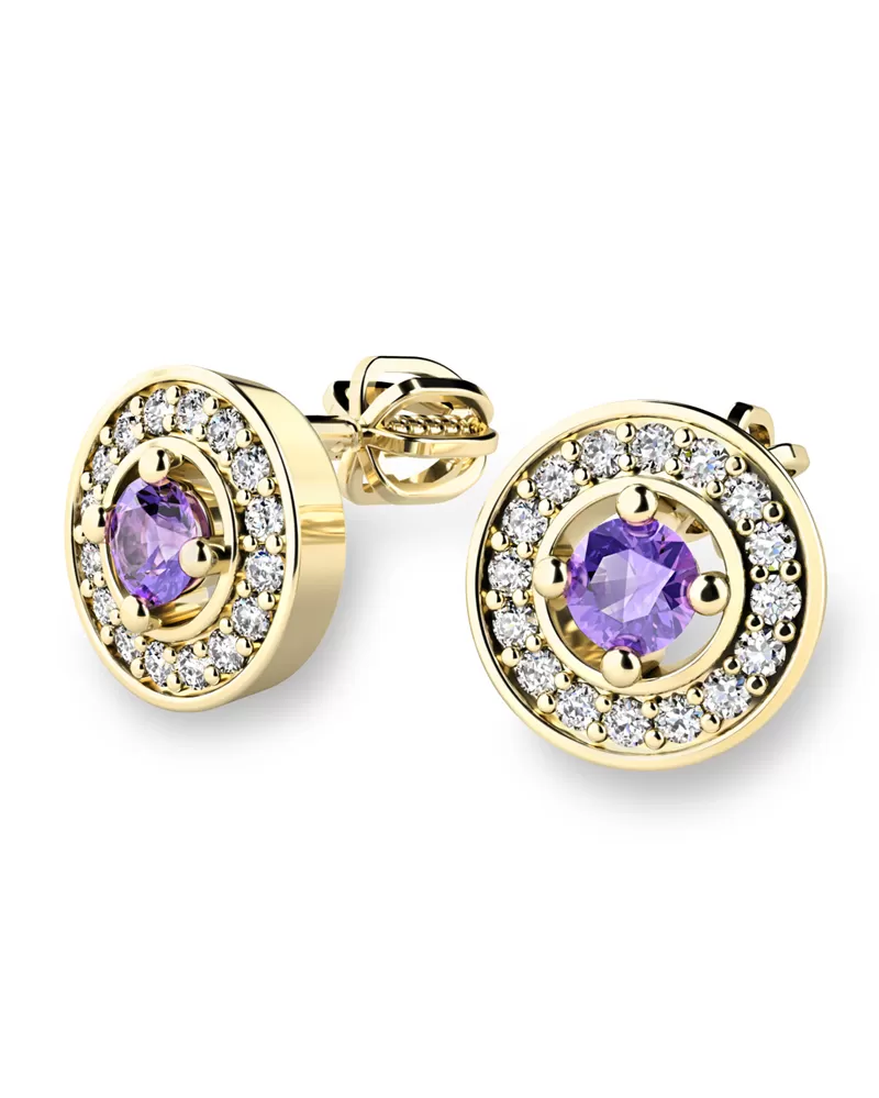 Nádherné luxusní dámské náušnice pecky osázené středovým ametystem a diamanty budou ideálním dárkem pro každou ženu. Náušnice jsou vyrobeny ze žlutého čtrnáctikarátového zlata - 585/1000 v lesklé povrchové úpravě. Vsazené diamanty jsou vybroušeny dokonalým briliantovým brusem, díky kterému dokonale odráží světlo a jejich brilance neuvěřitelné září z každého úhlu pohledu! Všechny kameny jsou pevně uchyceny krapnami. Vsazování diamantů a drahých kamenů provádějí naši nejzkušenější mistři zlatníci ručně pod mikroskopem s přesností na 0,01mm a proto nehrozí vypadnutí kamínků jako to bývá u strojně vyráběných náušnic. Celé náušnice působí dokonalým a luxusním dojmem! Náušnice se zapínají na šroubek. Šroubek pro balónek je umístěný cca 2 mm pod horní okraj náušnice a tedy krásně zakrývá dírku v uchu.