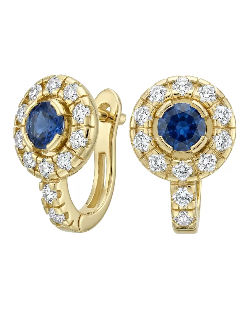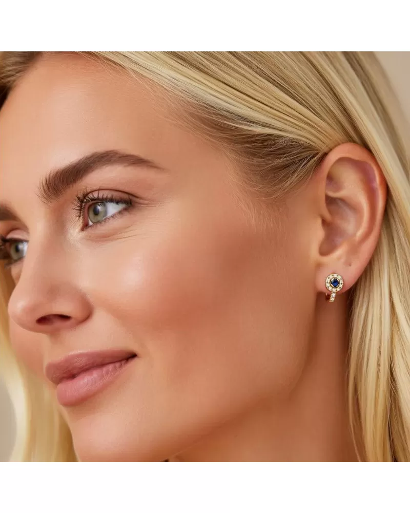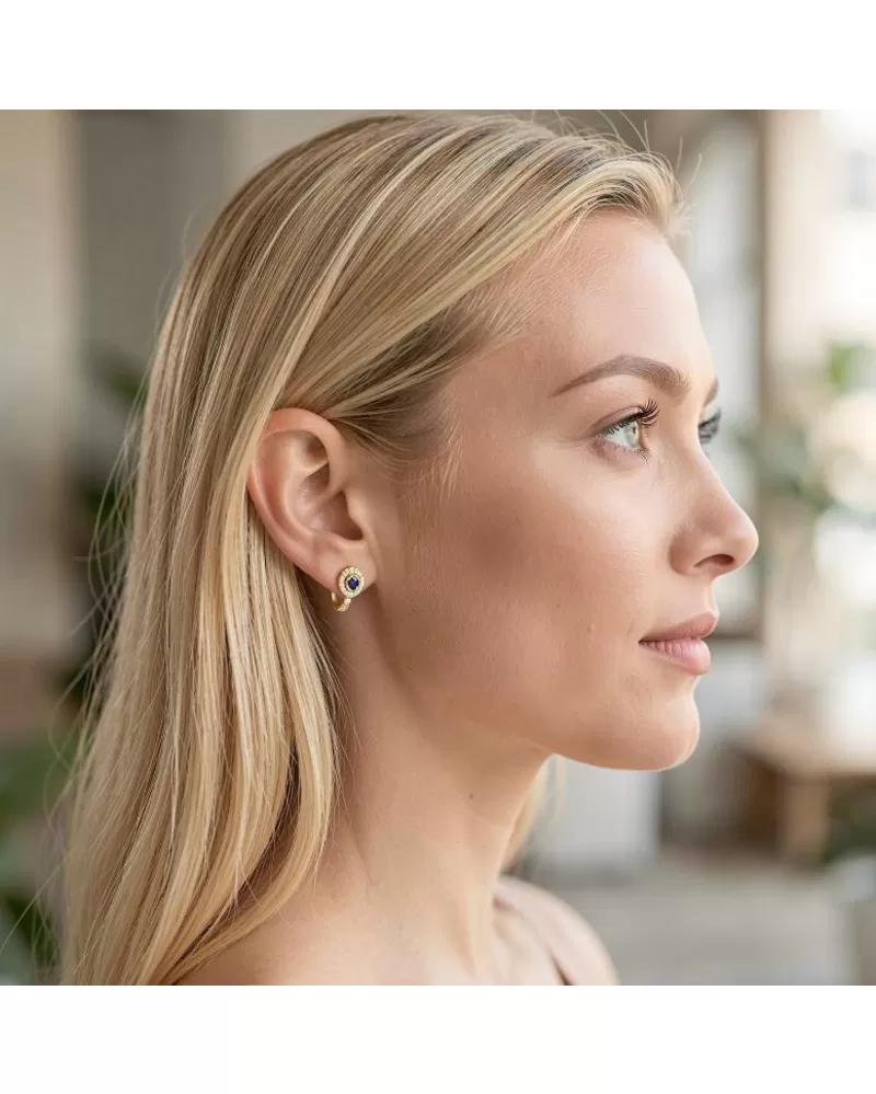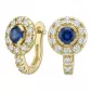 Náušnice typu "podkovičky" patří mezi velmi oblíbené typy náušnic, náušnice jsou vhodné pro každodenní nošení i na společenské akce a sluší každé ženě! Jsou vyrobeny ze žlutého čtrnáctikarátového zlata - 585/1000 v lesklé povrchové úpravě. V náušnicích je vsazeno "do krapniček" dvacetčtyři menších diamantů a dva větší centrální safíry. Všechny kameny jsou vybroušeny kulatým briliantovým brusem, který zajišťuje maximální brilanci vybroušených facet a krásně září ze všech úhlů pohledu! Vsazování diamantů a drahokamů provádějí naši nejzkušenější mistři zlatníci ručně pod mikroskopem s přesností na 0,01mm a proto nehrozí vypadnutí diamantů jako to bývá u strojně vyráběných šperků. Náušnice jsou středně velké, na uchu vypadají elegantně a přirozeně a díky skladbě a stylově čistému vsazení diamantů vynikají krásnou brilancí kamenů!