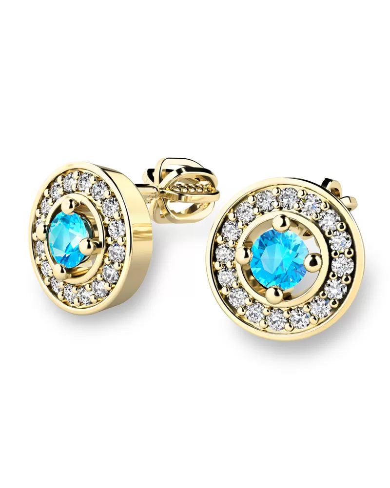 Nádherné luxusní dámské náušnice pecky osázené středovým topazem a diamanty budou ideálním dárkem pro každou ženu. Náušnice jsou vyrobeny ze žlutého čtrnáctikarátového zlata - 585/1000 v lesklé povrchové úpravě. Vsazené diamanty jsou vybroušeny dokonalým briliantovým brusem, díky kterému dokonale odráží světlo a jejich brilance neuvěřitelné září z každého úhlu pohledu! Všechny kameny jsou pevně uchyceny krapnami. Vsazování diamantů a drahých kamenů provádějí naši nejzkušenější mistři zlatníci ručně pod mikroskopem s přesností na 0,01mm a proto nehrozí vypadnutí kamínků jako to bývá u strojně vyráběných náušnic. Celé náušnice působí dokonalým a luxusním dojmem! Náušnice se zapínají na šroubek. Šroubek pro balónek je umístěný cca 2 mm pod horní okraj náušnice a tedy krásně zakrývá dírku v uchu.