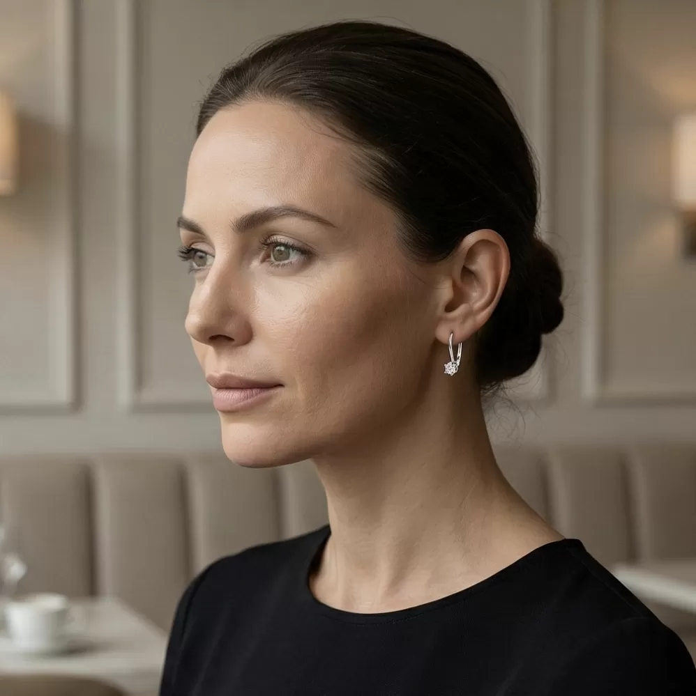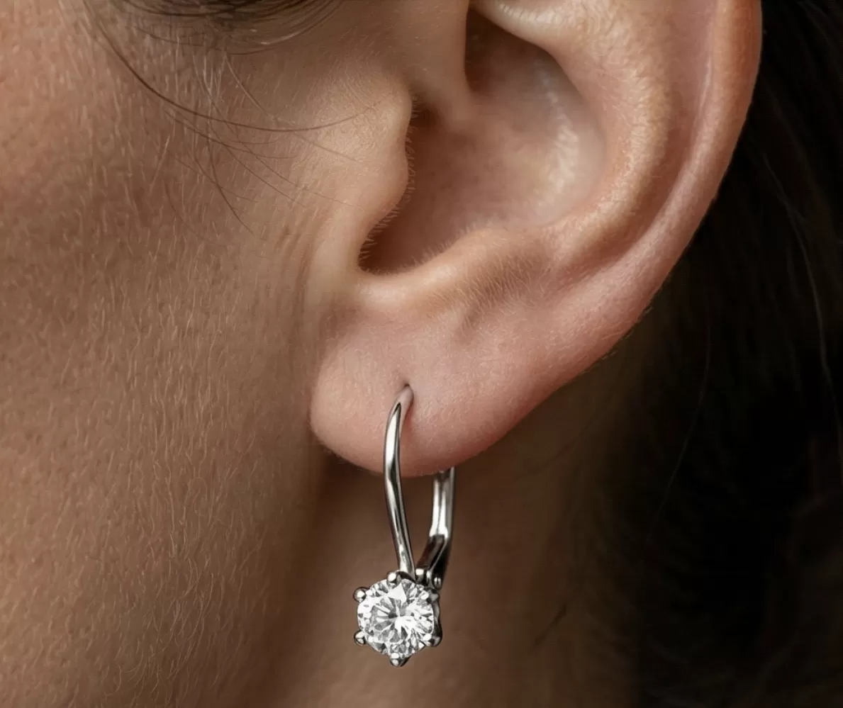 Nechce se rozmazlovat zářivými diamanty vsazené do visacích náušnic. Tyto nádherné, zářivé náušnice jsou vyrobeny z bílého čtrnáctikarátového zlata - 585/1000 v lesklé povrchové úpravě. Visací náušnice jsou zdobeny jedním diamantem briliantového brusu, který je vsazen do náušnic a obklopen šesti krapnami. Díky preciznímu brusu diamanty získají dokonalou brilanci. Skvěle odráží světlo a září. Zapínání náušnic je na klapku.