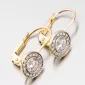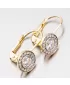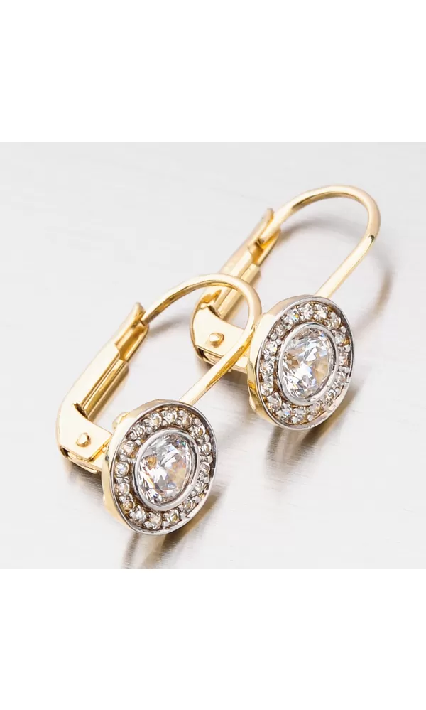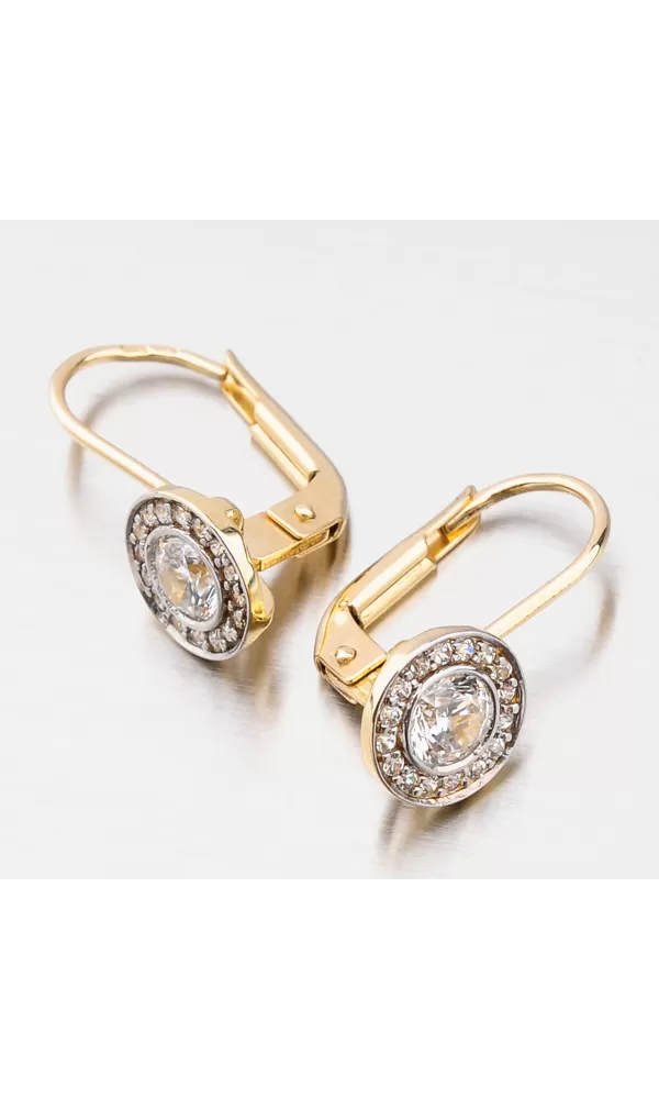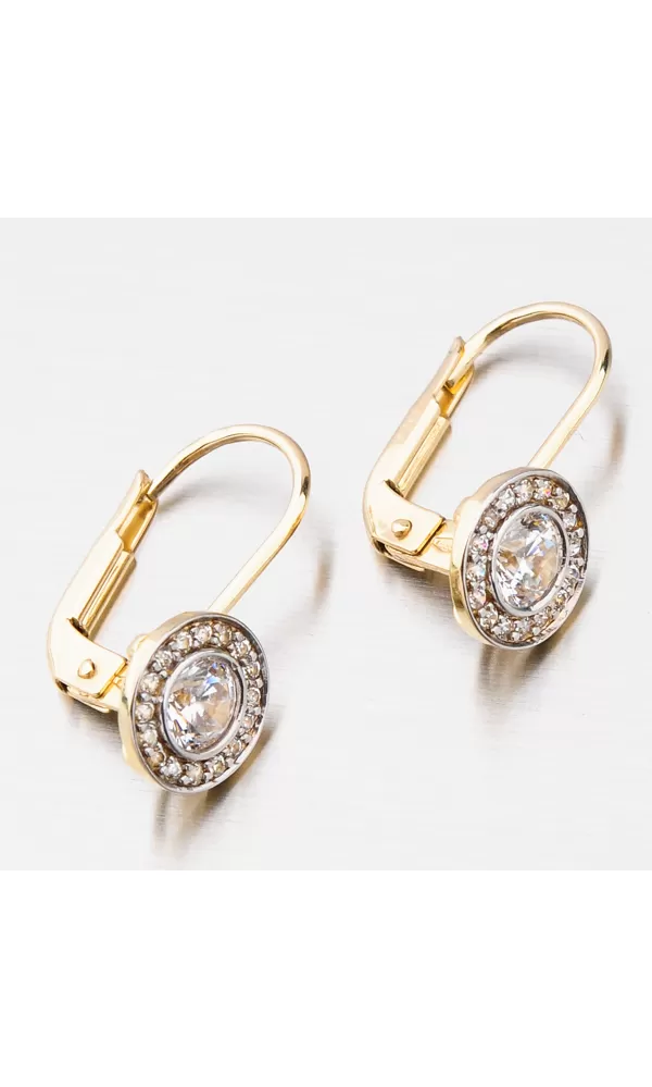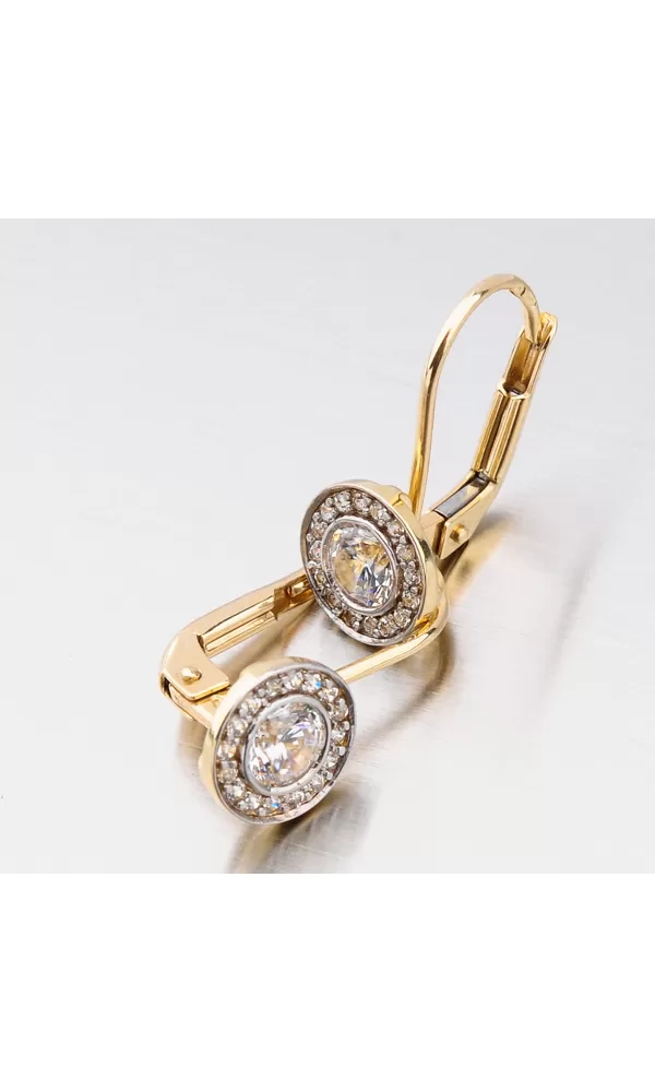 Překrásné náušnice jsou zdobeny ozdobou v kulatém tvaru. Uprostřed kruhu je vsazen s maximální pečlivostí velký zirkon v briliantovém brusu a kolem něj jsou vsazeny menší neméně zářivé zirkony také v briliantovém brusu. Tento brus zirkonům dodává brilanci pravých diamantů. Pro maximální spolehlivost a bezpečí se náušnice zapínají na klapku.