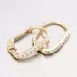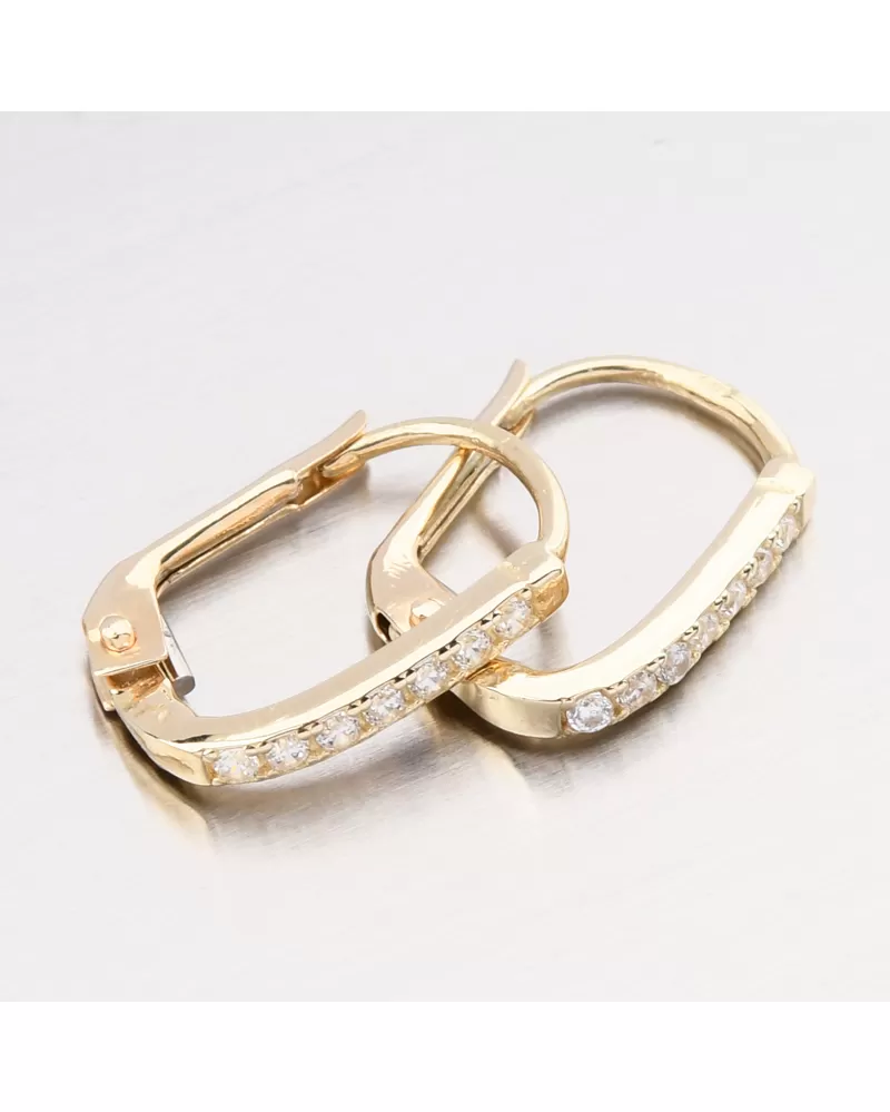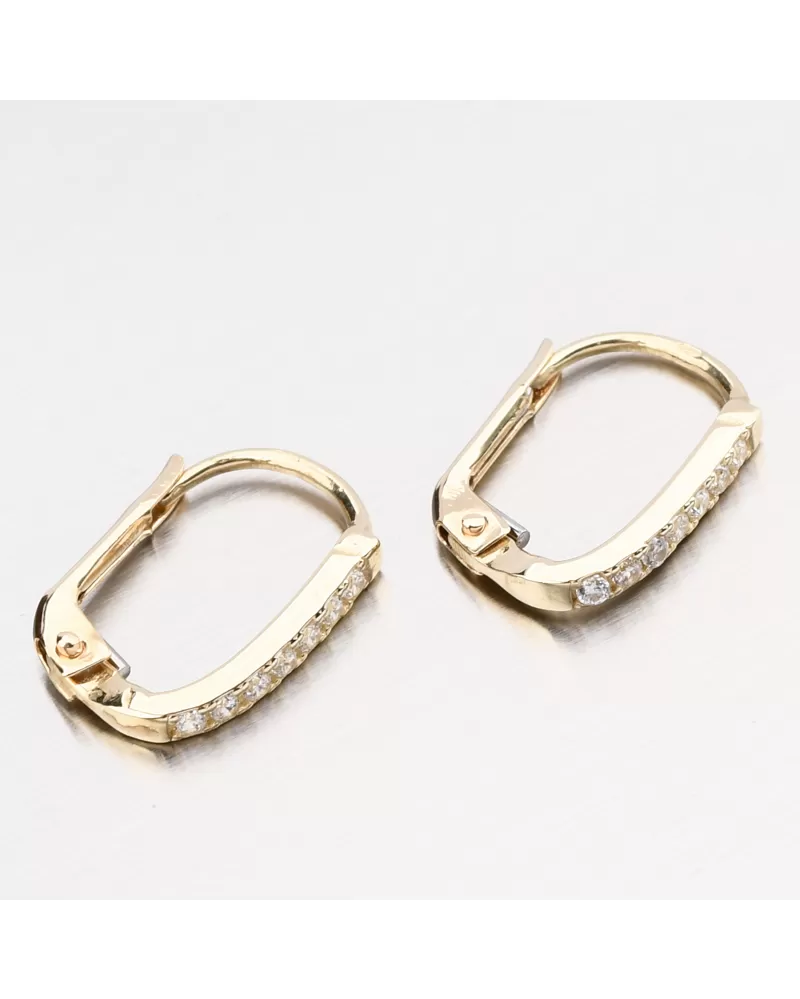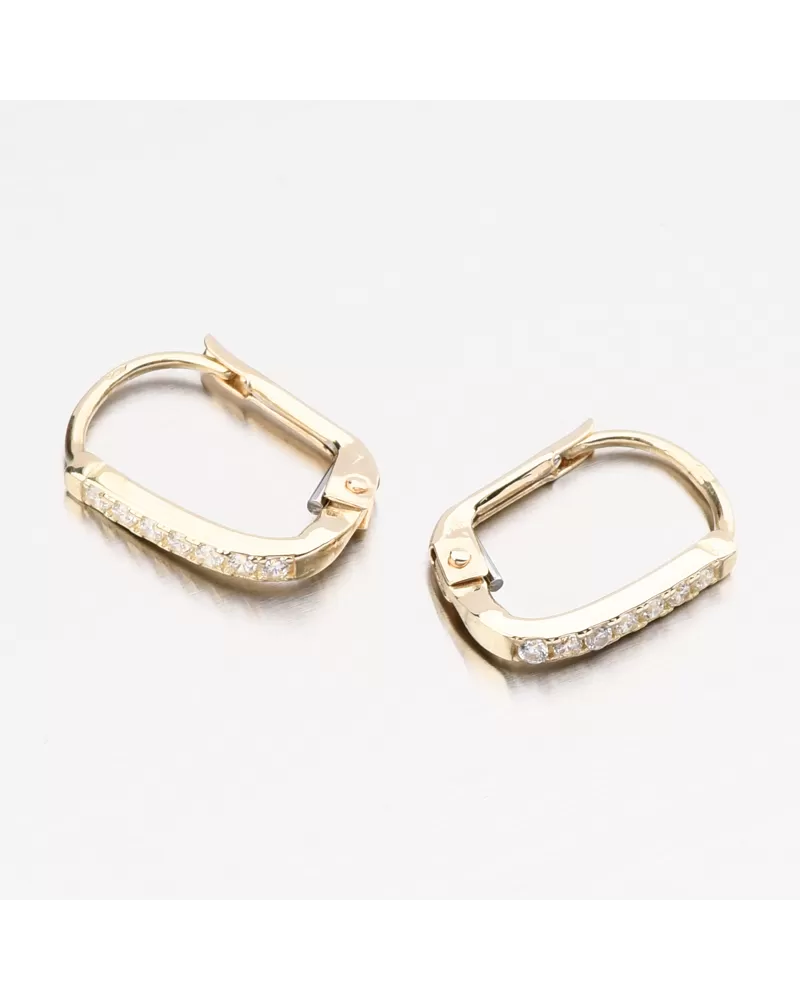 Jemné zlaté náušnice v minimalistickém designu. Ozdoba náušnic je hranatého tvaru a na přední straně osazena bílými zirkony briliantového brusu. Tento brus propůjčuje kamenům brilanci pravých diamantů.