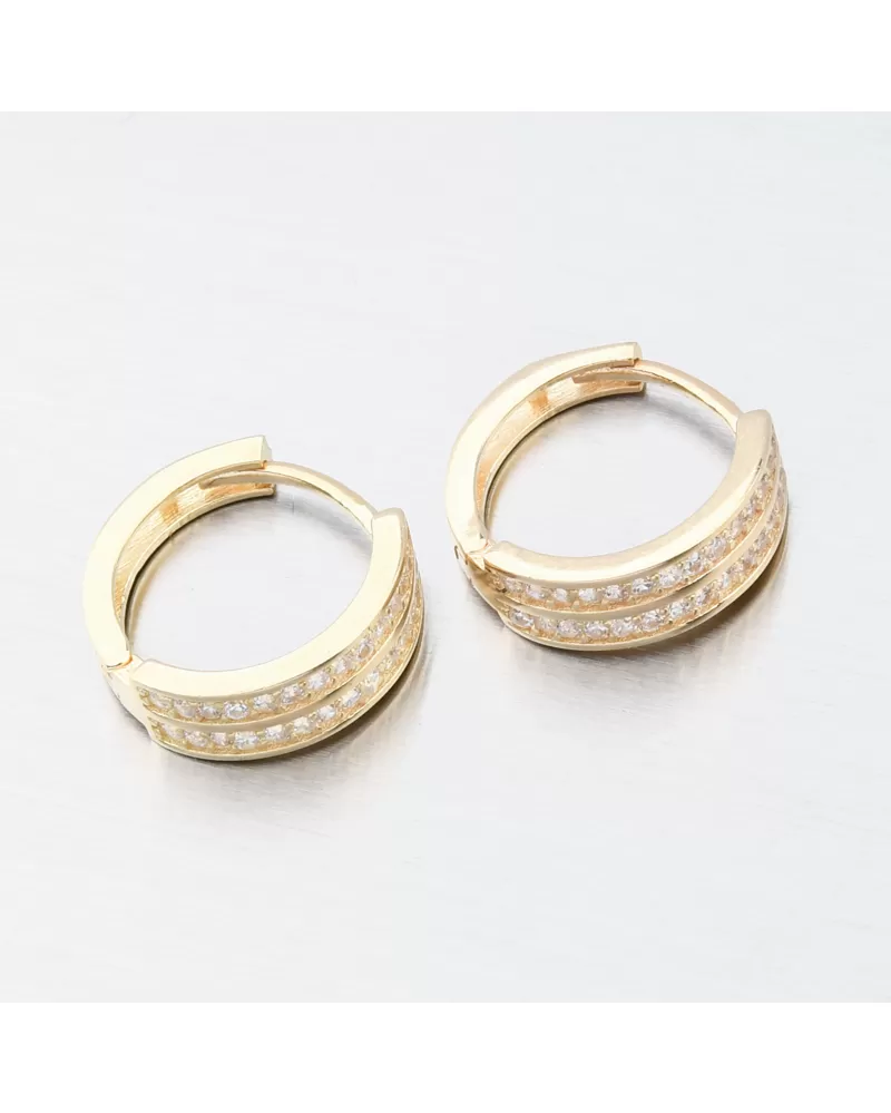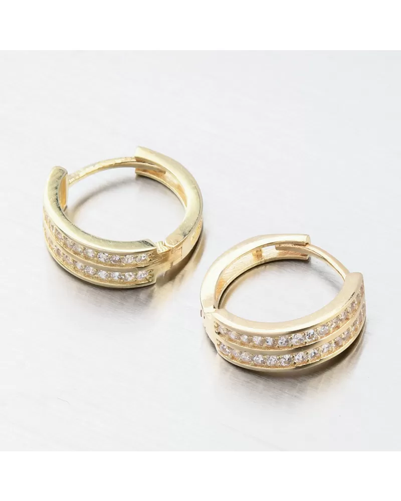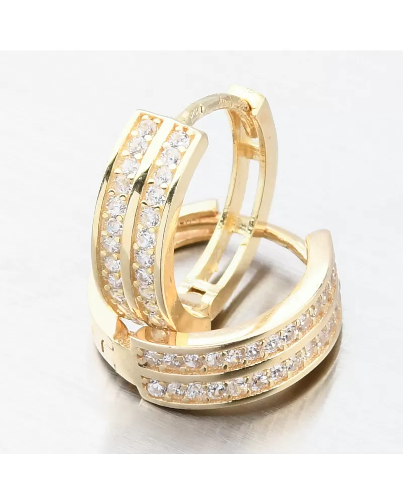 Jemné, ale výrazné náušnice zdobené dvěma řadami jiskřivých zirkonů. Zirkony jsou briliantového brusu, zajišťuje maximální brilanci vybroušených facet, dokonale odráží světlo a neuvěřitelně září z každého úhlu pohledu. Kruhy patří k nestárnoucím doplňkům, které musí mít každá žena ve své šperkovnici. Náušnice jsou díky své konstrukci vhodné pro každodenní nošení a spolu s fantastickým zapínáním, které se jen jednoduše zaklapne a drží, budou ideálním šperkem.