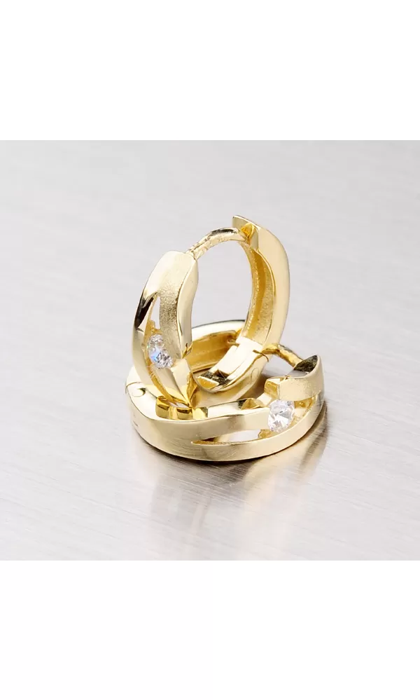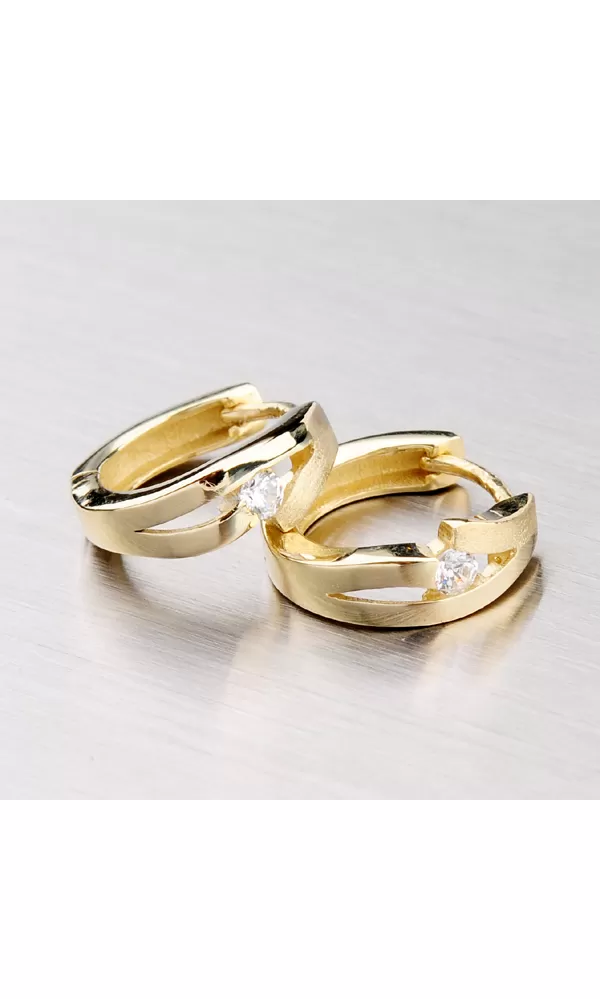 Elegantní dámské náušnice - kroužky s bílým zirkonem jsou vyrobené ze žlutého čtrnácti karátového zlata 585/1000 v kombinaci lesklé a matné povrchové úpravy. Kruhy patří k nejoblíbenějším typům náušnic hlavně díky svému tvaru a vzhledu. Náušnice se hodí pro všechny příležitosti.
