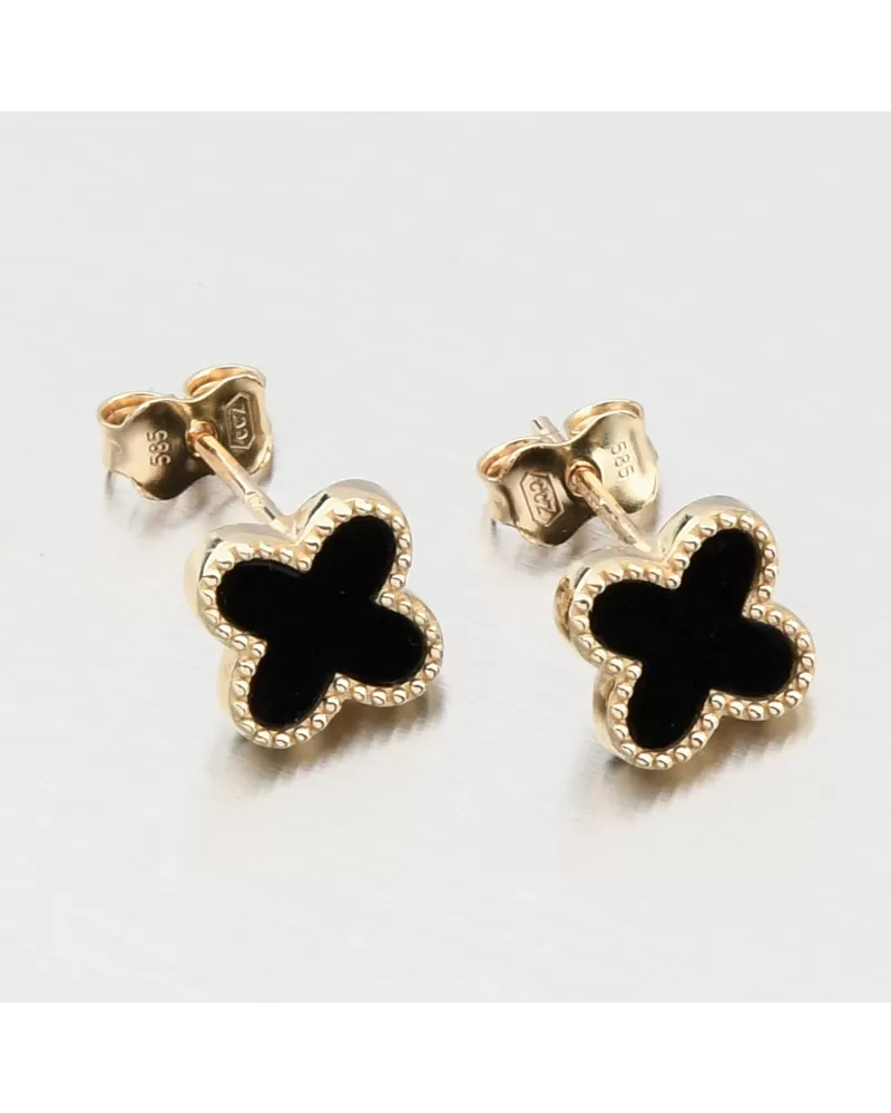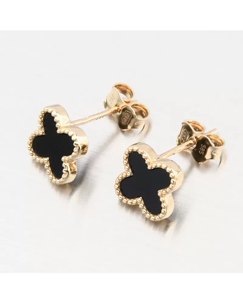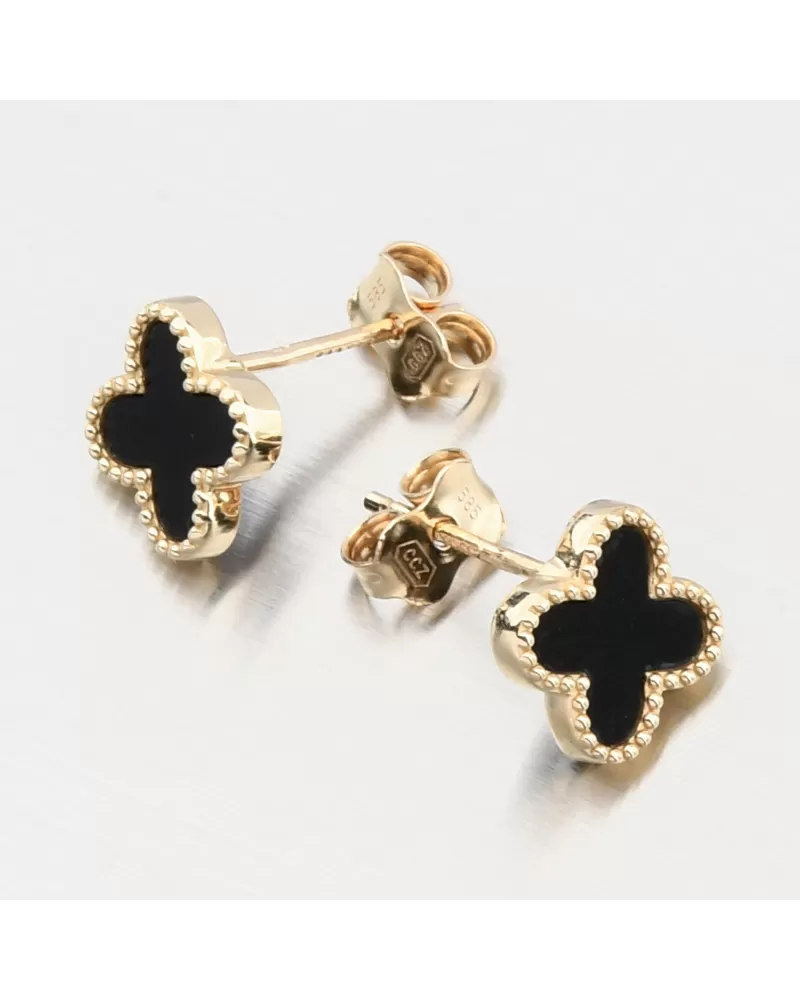 Moderní náušnice v oblíbeném tvaru čtyřlístku zdobené černým smaltem. Kombinace žlutého zlata s černou barvou je velmi elegantní. Náušnice jsou dokonale zpracované do nejmenších detailů a budou tak ideálním dárkem, který zaručeně potěší dívku či ženu.