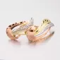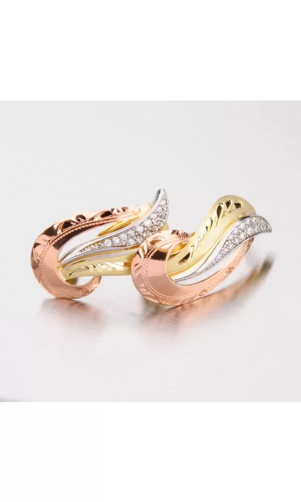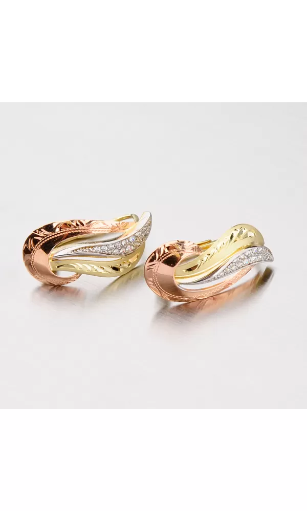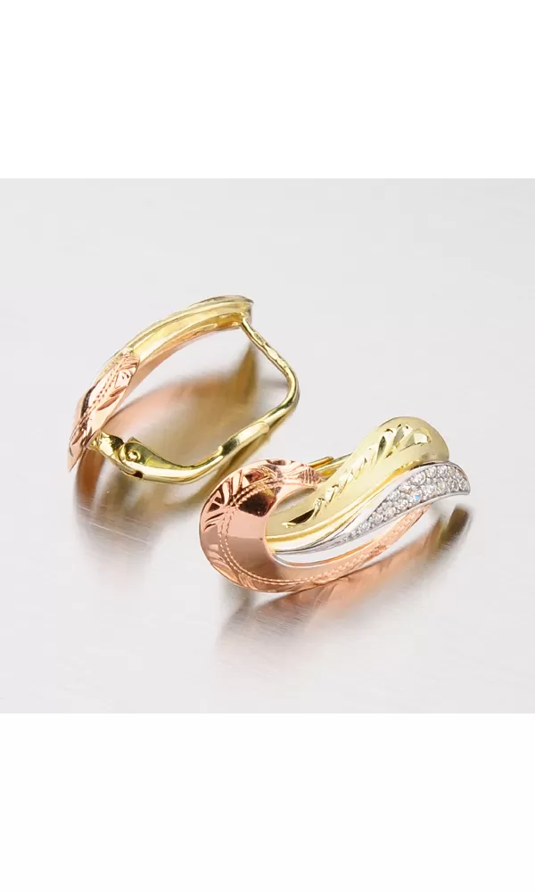 Zářivé náušnice se zirkony vás okouzlí na první pohled. Náušnice se Vám budou hodit jak pro společenské události, tak pro každodenní nošení. Dámské náušnice vyrobené ze žlutého, červeného a bílého čtrnáctikarátového zlata 585/1000 v kombinované povrchové úpravě lesk - mat. Prostřední esíčko je osázeno kulatými zirkony a krajní výlisky jsou zdobeny ručním rytím. Náušnice mají klasické zapínáním na klapky. Zaujměte těmito nepřehlédnutelnými náušnicemi!