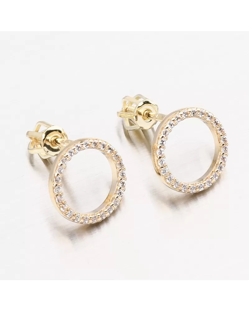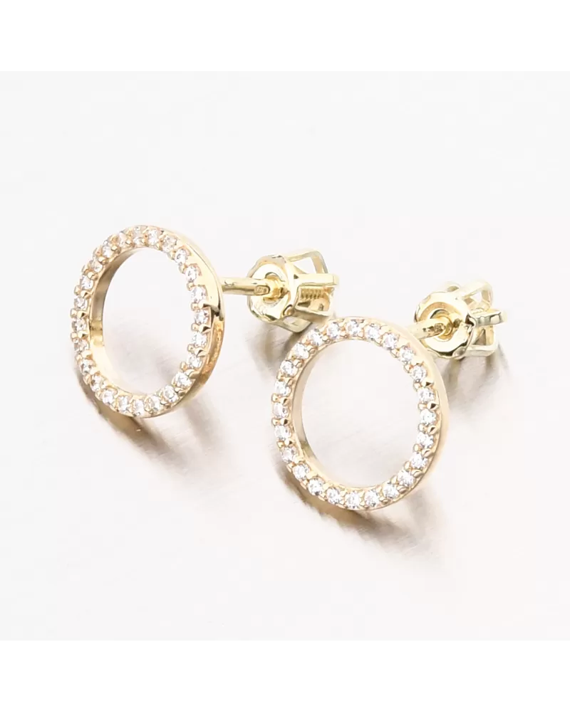 Nadčasové zlaté náušnice s ozdobou ve tvaru kruhu. Kruh o průměru 11 mm je po celém obvodu osazen zářivými zirkony briliantového brusu. Briliantový brus zajišťuje maximální brilanci vybroušených facet, dokonale odráží světlo a neuvěřitelně září z každého úhlu pohledu.