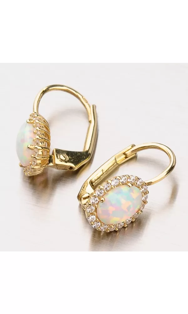 Těmto náušnicím neodoláte. Jejich dominantou je opál, který hraje všemi barvami. Opál je oválného tvaru a pro větší luxus je opál osázený zářivými zirkony v briliantovém brusu. Elegantní dámské náušnice jsou vyrobeny ze žlutého čtrnáctikarátového zlata 585/1000 v lesklé povrchové úpravě se zapínáním na klapku.