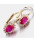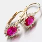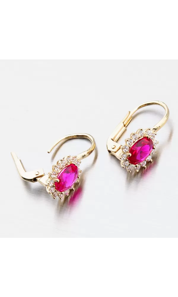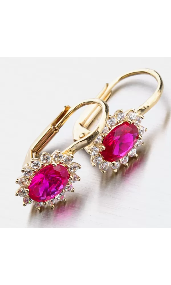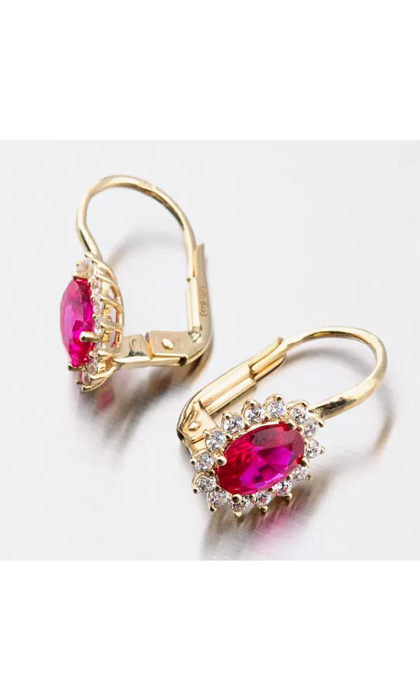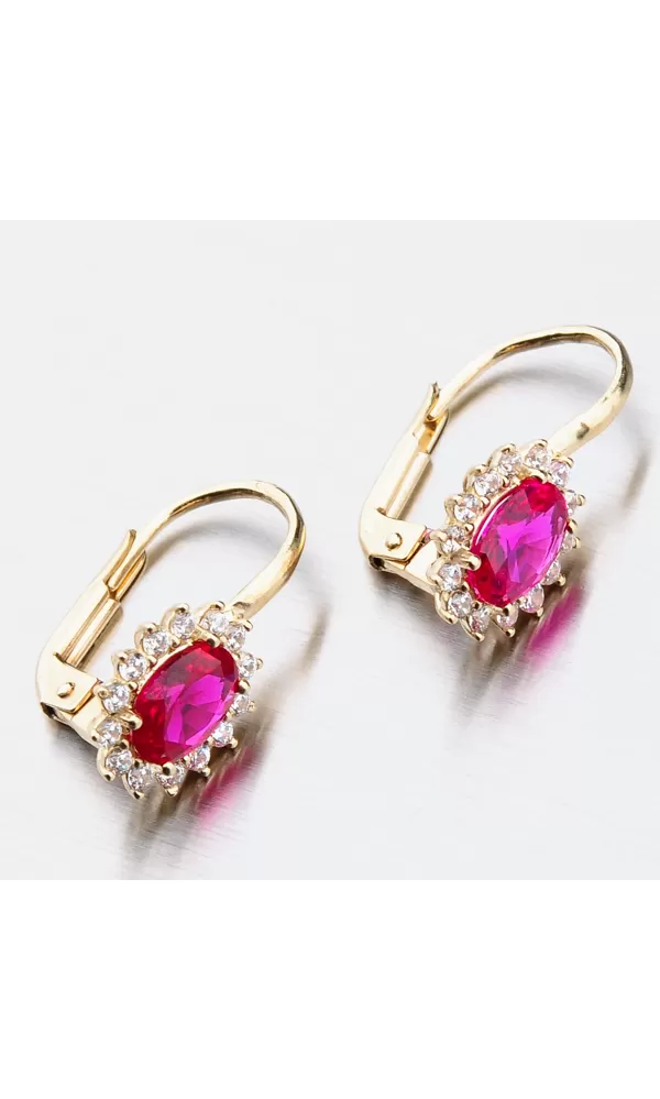 Nechte se okouzlit výjimečným šperkem. Tyto zlaté náušnice zaujmou na první pohled syntetickým rubínem, který je broušen do oválného tvaru. Tento červený kámen pevně svírají čtyři krapny. Okolo syntetického rubínu jsou vsazeny zirkony v briliantovém brusu. Toto provedení zlatých náušnic nikdy nevyjde z módy a jejich design je vhodný pro každodenní nošení i do společnosti.