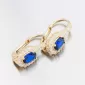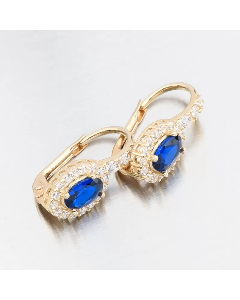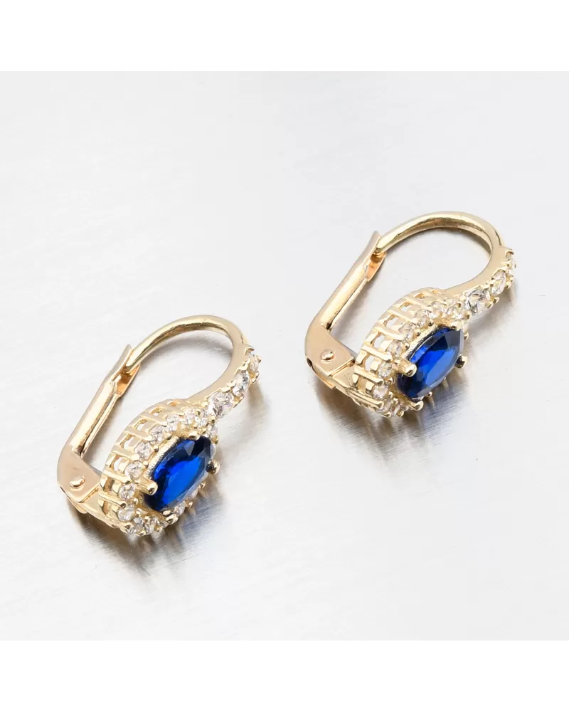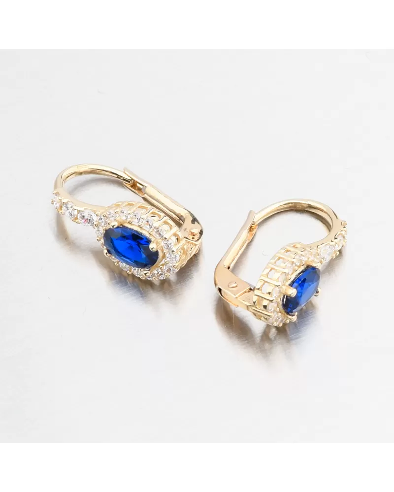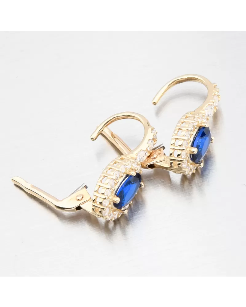 Zlaté náušnice se můžou pyšnit syntetickým modrým safírem oválného tvaru upevněný pomocí čtyř krapen. Safír je dominantou tohoto modelu náušnic a je především volbou pro elegantní a sofistikovaný vzhled. Okolo safíru jsou vsazeny zirkony briliantového brusu a současně také na přední straně zapínání. Briliantový brus zajišťuje maximální brilanci vybroušených facet, dokonale odráží světlo a neuvěřitelně září z každého úhlu pohledu.