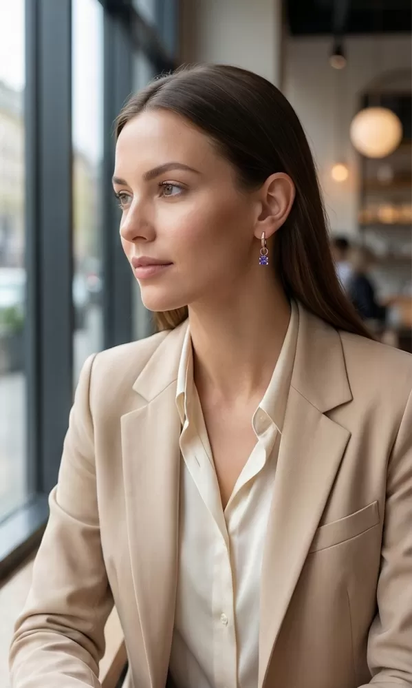 Jemné náušnice - oválky jsou vhodné pro každodenní nošení i na společenské akce a jistě budou slušet každé ženě. Tento model je zdoben dvěma menšími kulatými diamanty a zavěšenými korunkami osazenými fialovými tanzanity. Všechny kameny jsou v briliantovém brusu, který dodává kamenům maximální brilanci a lesk. Vsazování diamantů a drahých kamenů provádějí naši nejzkušenější mistři zlatníci ručně pod mikroskopem s přesností na 0,01mm a proto nehrozí vypadnutí kamínků jako to bývá u strojně vyráběných náušnic. Tyto elegantní náušnice jsou vyrobeny z růžového čtrnáctikarátového zlata - 585/1000 v lesklé povrchové úpravě.