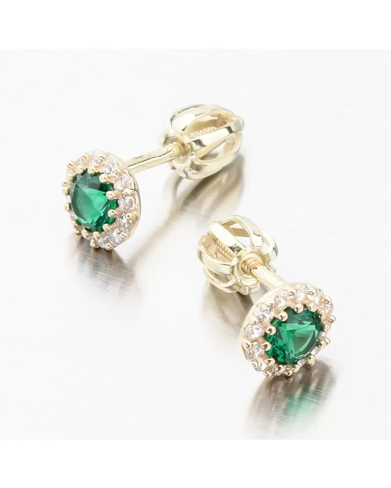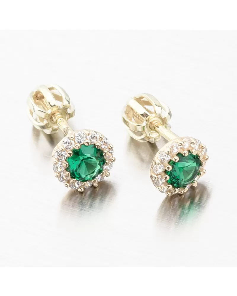 Zlaté náušnice - pecky se můžou pyšnit syntetickým smaragdem upevněný pomocí krapen po celém obvodu. Smaragd je dominantou tohoto modelu náušnic a dokonale zvýrazní přednosti obličeje a doplní celkový vzhled. Okolo něj jsou vsazeny čiré zirkony briliantového brusu. Tento brus propůjčuje kamenům brilanci pravých diamantů.