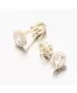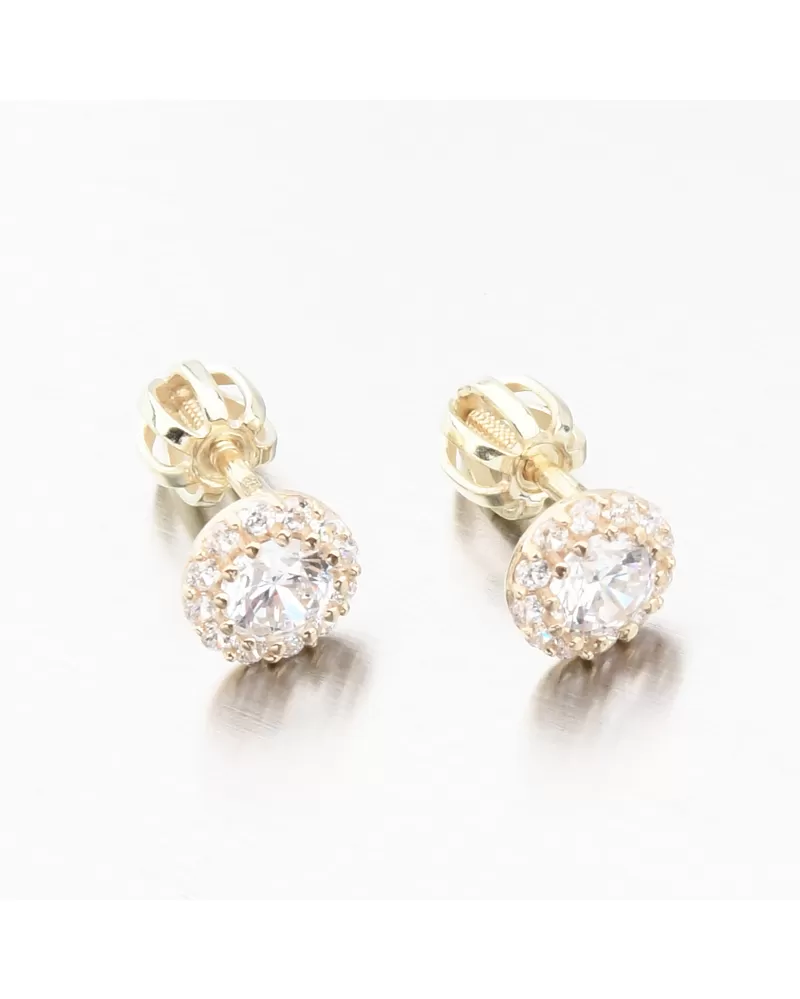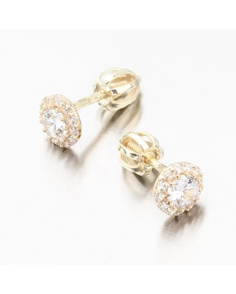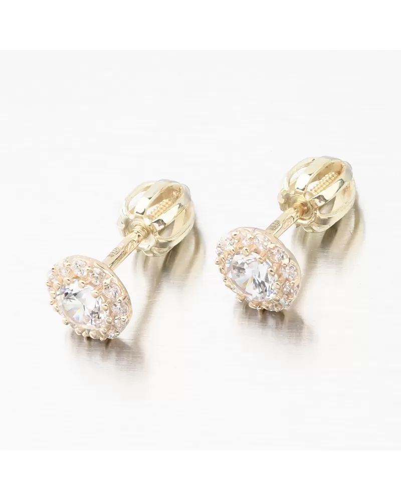 Zlaté náušnice - pecky osazené nádhernými třpytivými zirkony. Ve středu je jeden výrazný zirkon a poté okolo něj jsou vsazeny drobné zirkony briliantového brusu. Tento brus propůjčuje kamenům brilanci pravých diamantů.